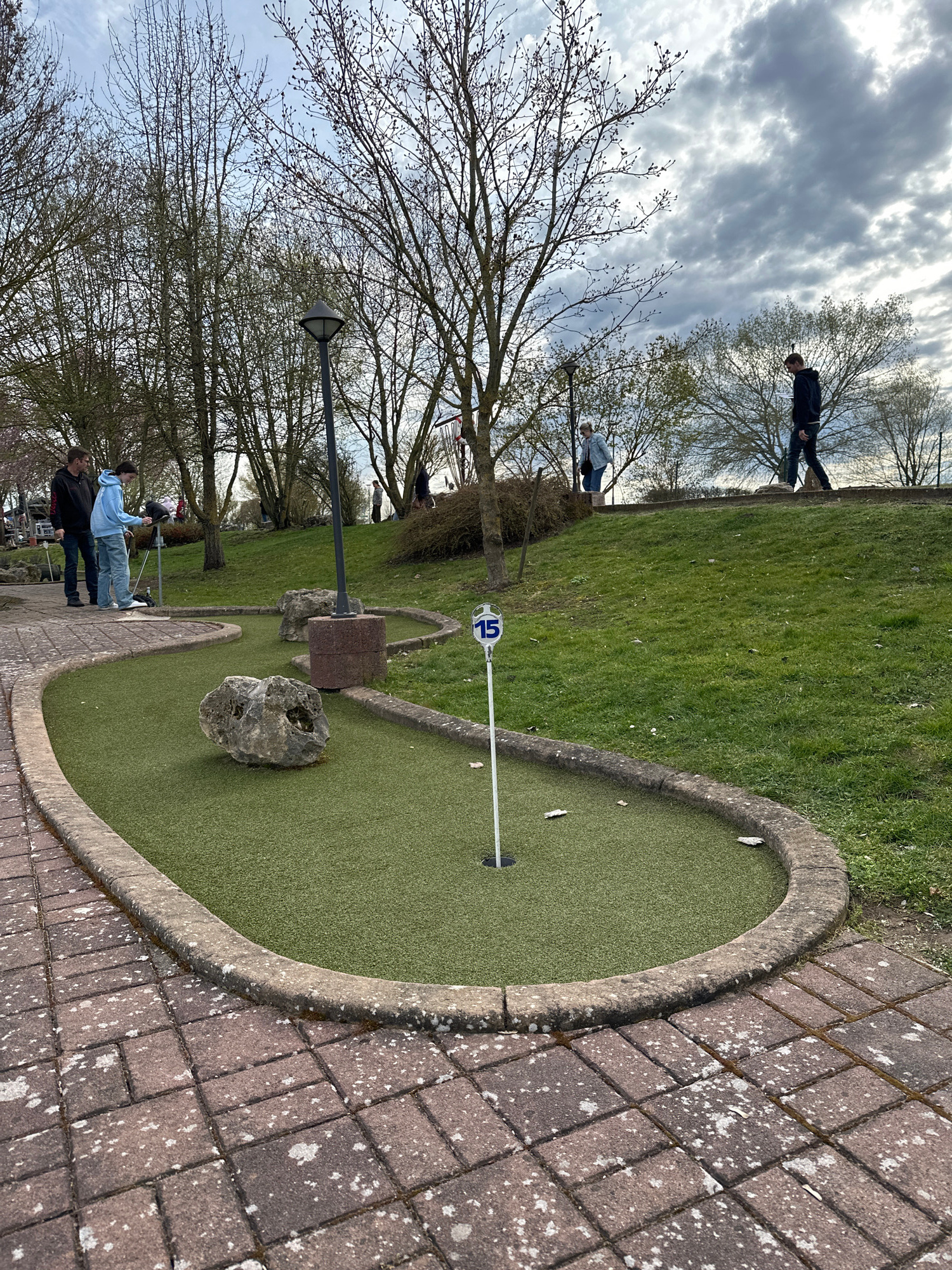 This is an outdoor scene at a miniature golf course. The focus is on hole number 15, indicated by the number on a pole near the hole. The hole is circular, with a green surface and a stone border. Theβ¦read more