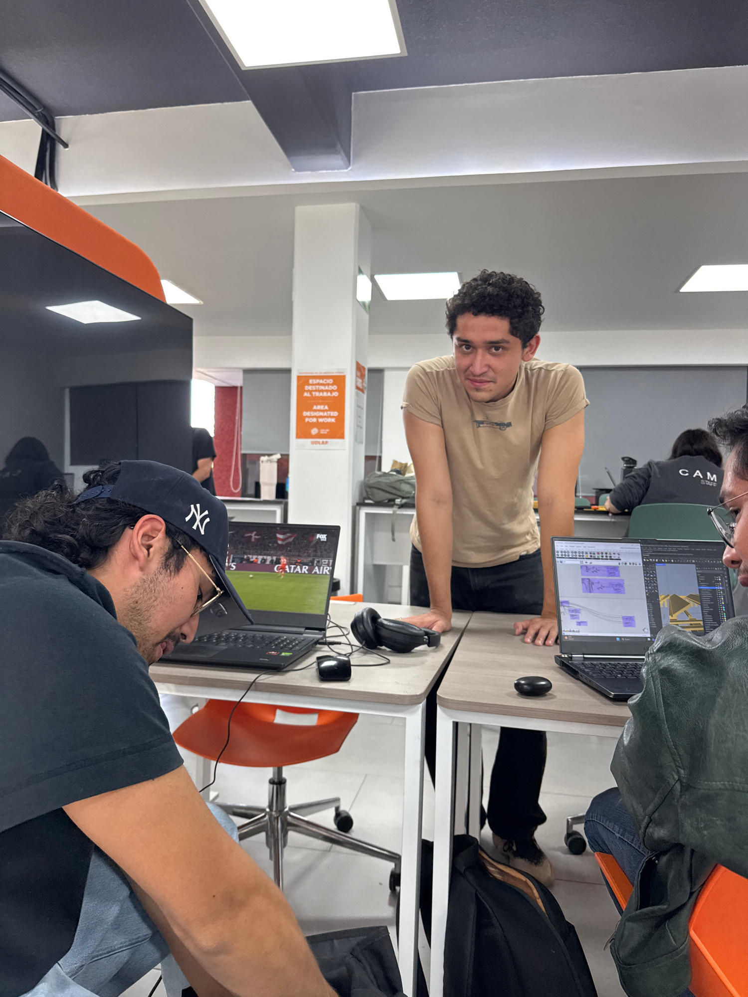 The photograph shows an indoor scene, possibly an office or study area in San Andrés Cholula, Mexico. Three individuals are present, engaged in activities involving laptops. One man in a tan t-shirt…read more