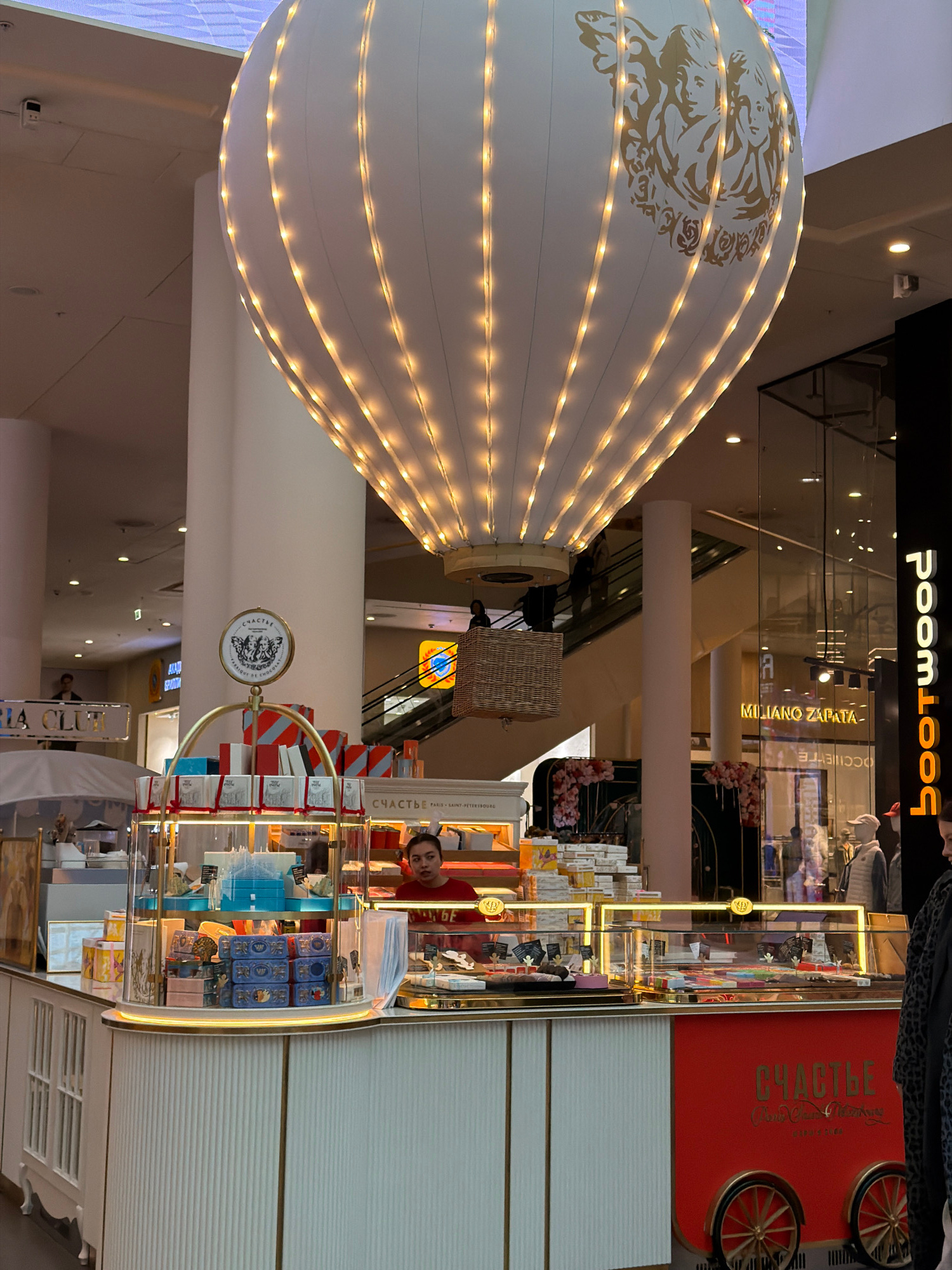 The image depicts an indoor view, seemingly inside a shopping mall in Saint Petersburg, Russia, featuring a large, white, hot air balloon-shaped art installation with gold accents and illuminated with…read more