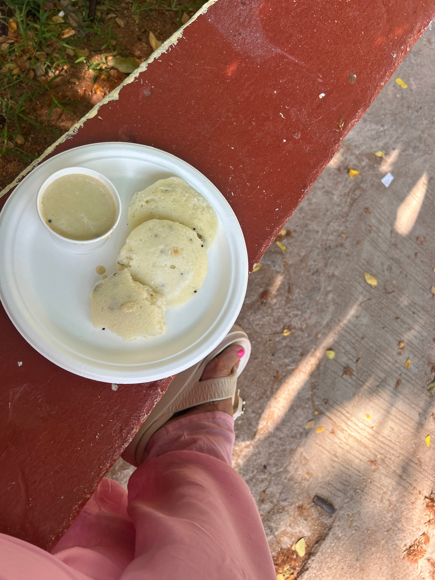 A high-angle shot depicts a white plastic plate containing three idlis (South Indian rice cakes) and a small container of chutney, placed on a red-painted bench in Puttaparthi, India. Adjacent to the…read more