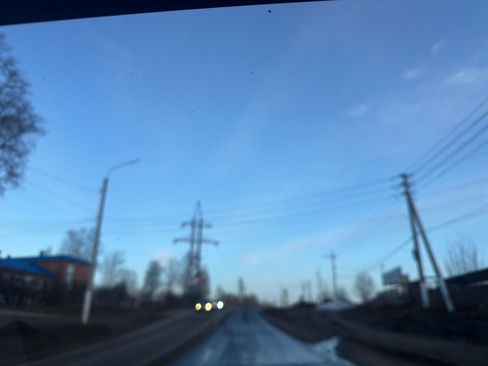 The image shows a blurry view of a road in a town, possibly the city of Chaikovsky, Russia, under a blue sky with scattered clouds. An electric power tower is visible in the distance, flanked by lamp…read more