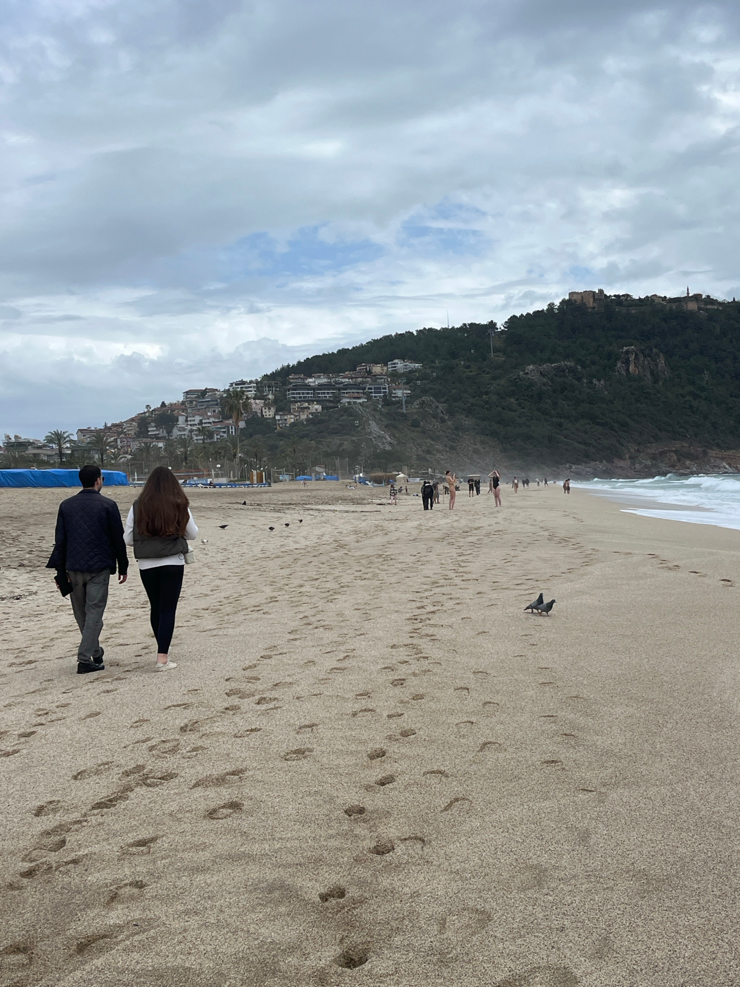 The image depicts a beach scene in Alanya, Turkey. The sky is overcast with a mix of gray and white clouds. To the left, a steep hillside is covered with dense vegetation, dotted with buildings and in…read more