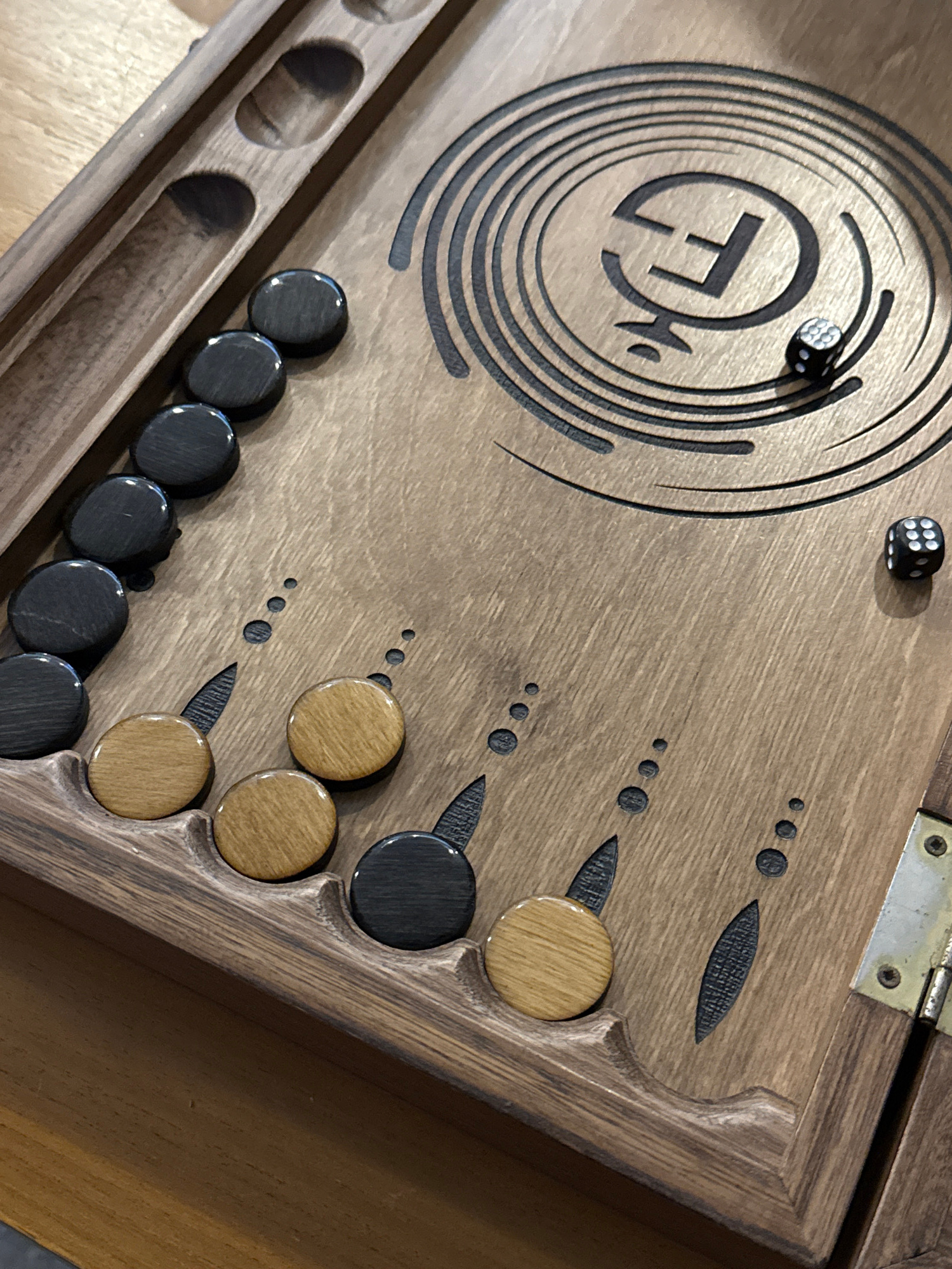The image depicts a partially open wooden backgammon board. The board is inlaid with a circular design containing a stylized letter "F" and a fish. There are two black dice on the board, one on the ci…read more