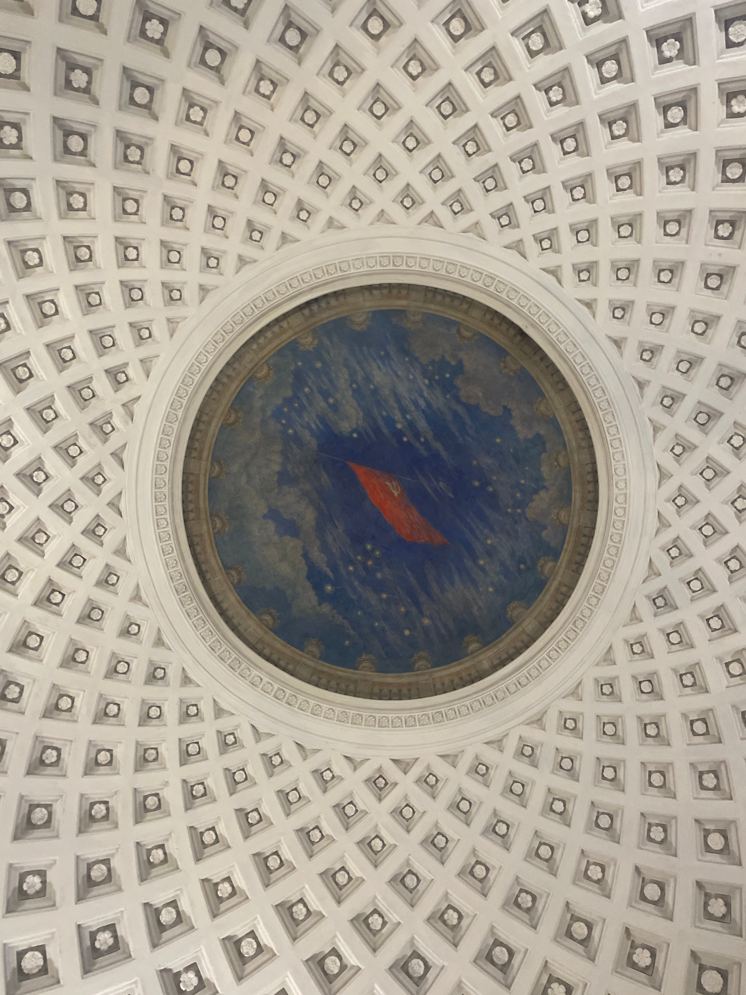The image shows the ceiling of the mausoleum of Vladimir Lenin in Moscow, Russia. The ceiling has a coffered design with a central circular area containing a mural of a red flag against a blue sky wit…read more