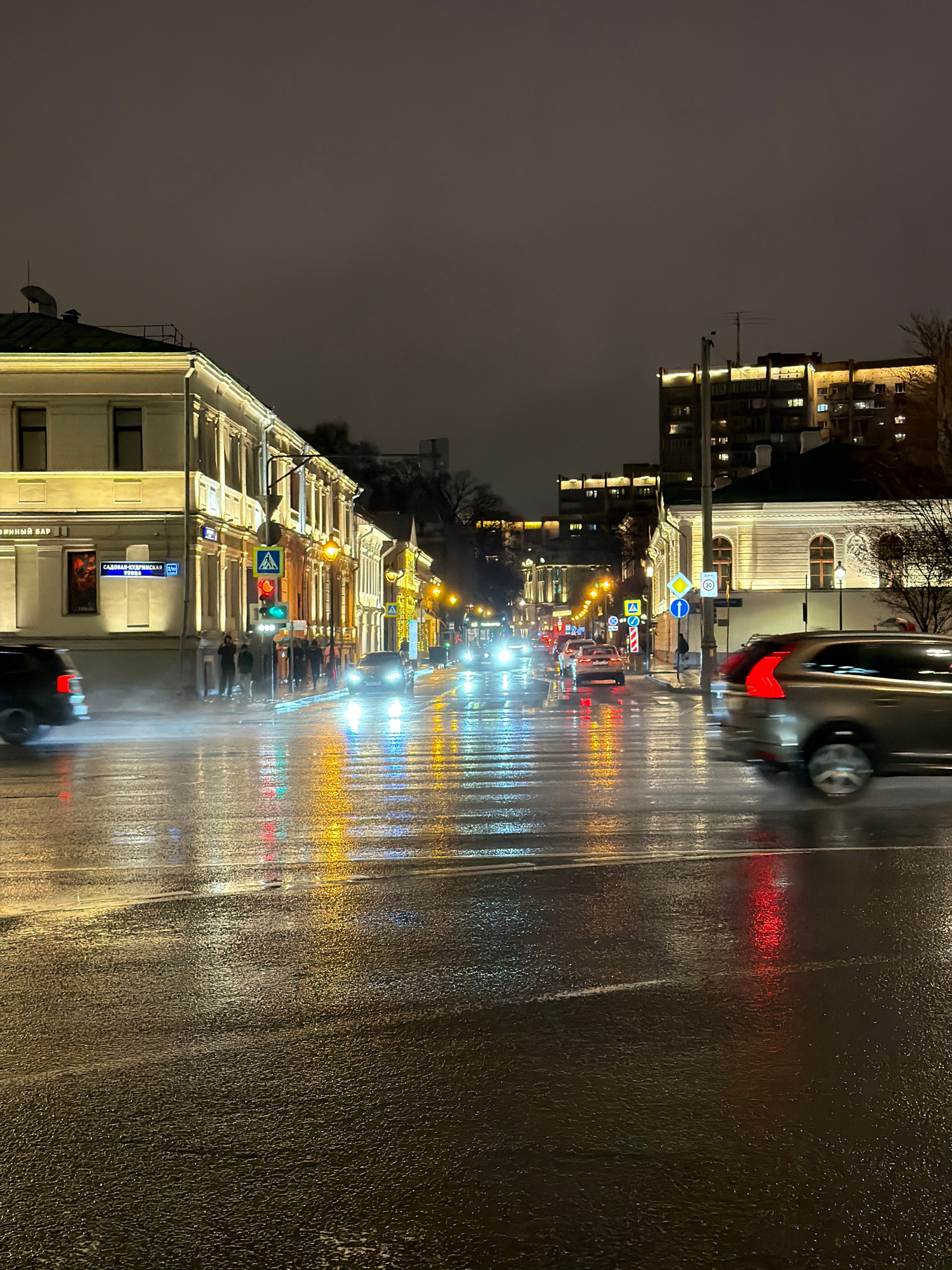 The image depicts a street scene in Moscow, Russia at night during a rainstorm. The street is wet, with reflections of the streetlights and vehicle lights visible on the asphalt. Numerous cars with th…read more