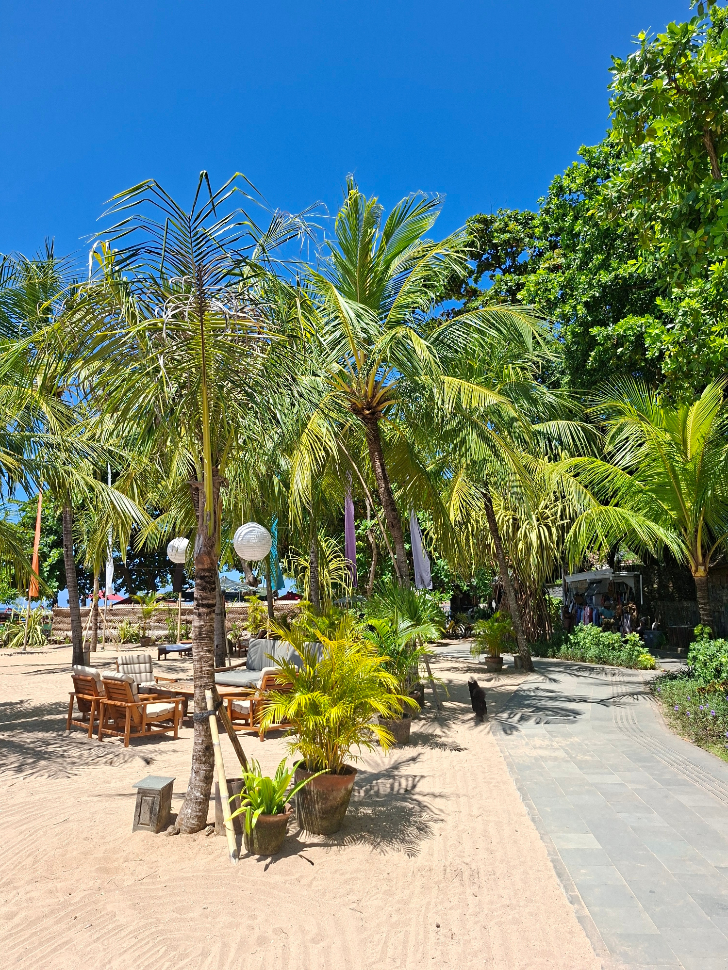 This image shows a beach scene in Denpasar, Indonesia, with palm trees lining a sandy area. Wooden chairs and tables are arranged under the trees, suggesting a relaxed outdoor dining or lounging area.…read more