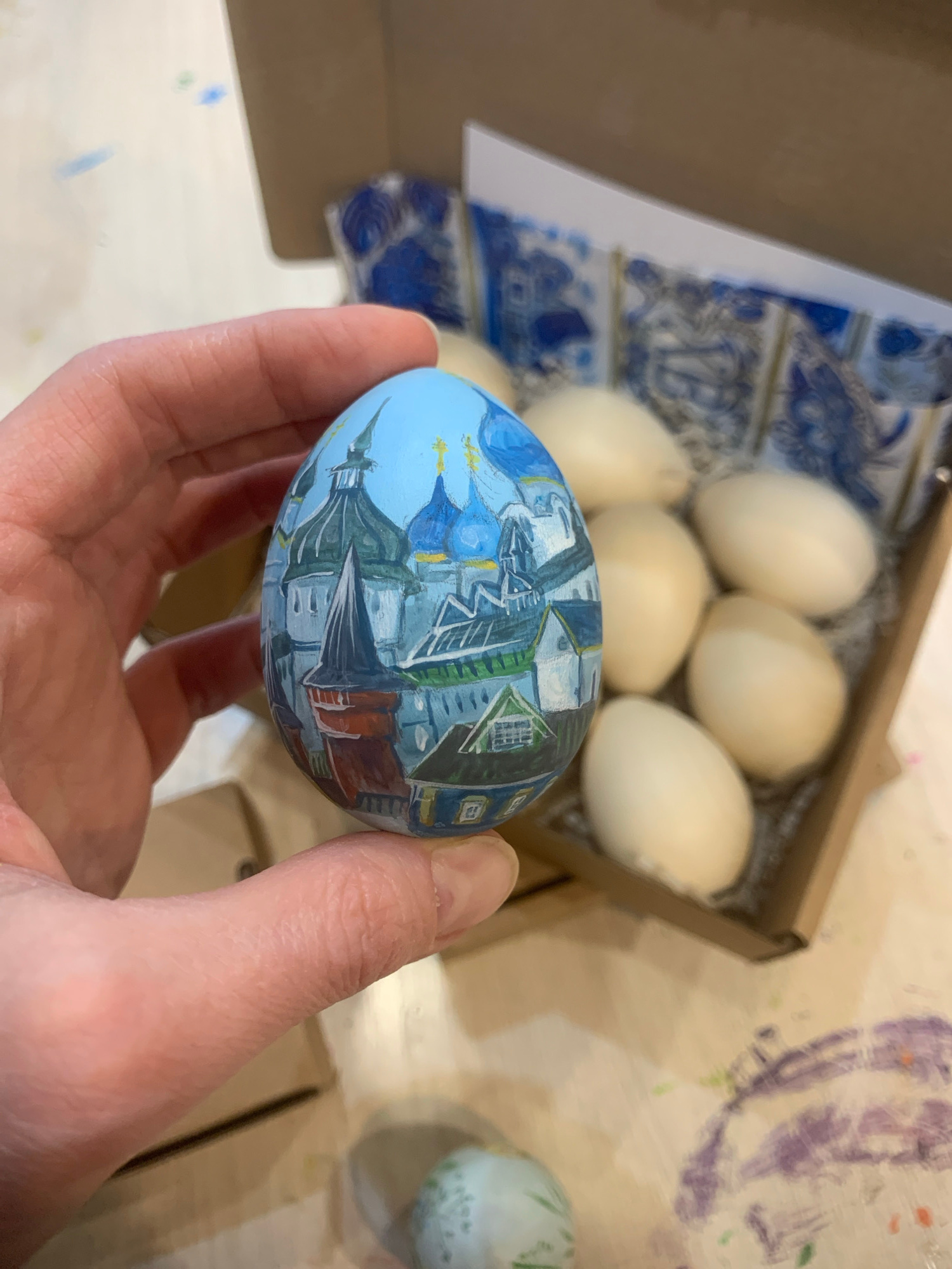 A hand holds a painted egg. The egg is decorated with an image of architecture in blue, grey, red and white. Behind the egg is a cardboard box containing six plain white eggs. The box interior is line…read more