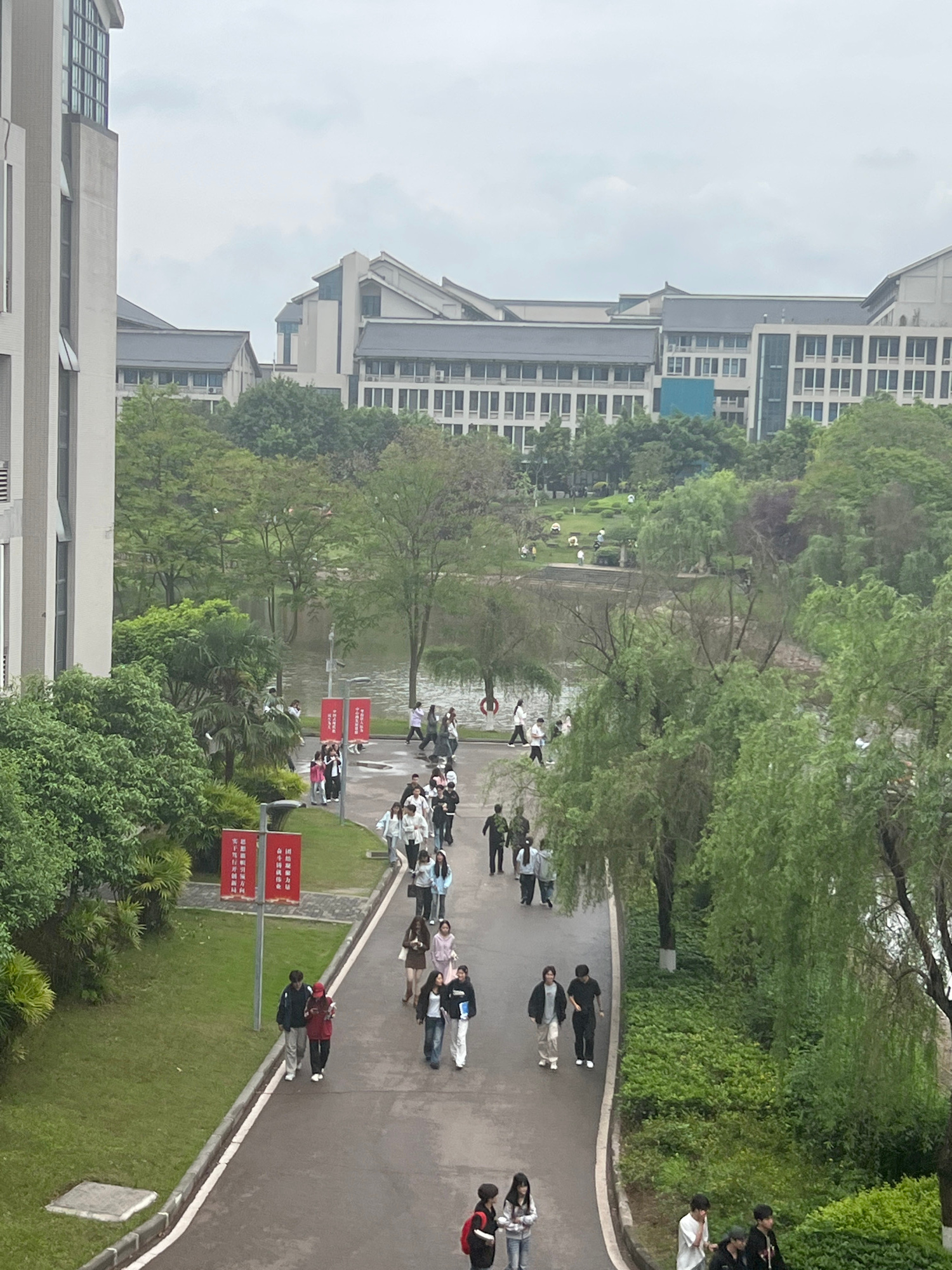 The image shows a view from an elevated position, likely a building, overlooking a section of what appears to be a university campus in Jiangjin, China. Several buildings with light-colored facades an…read more