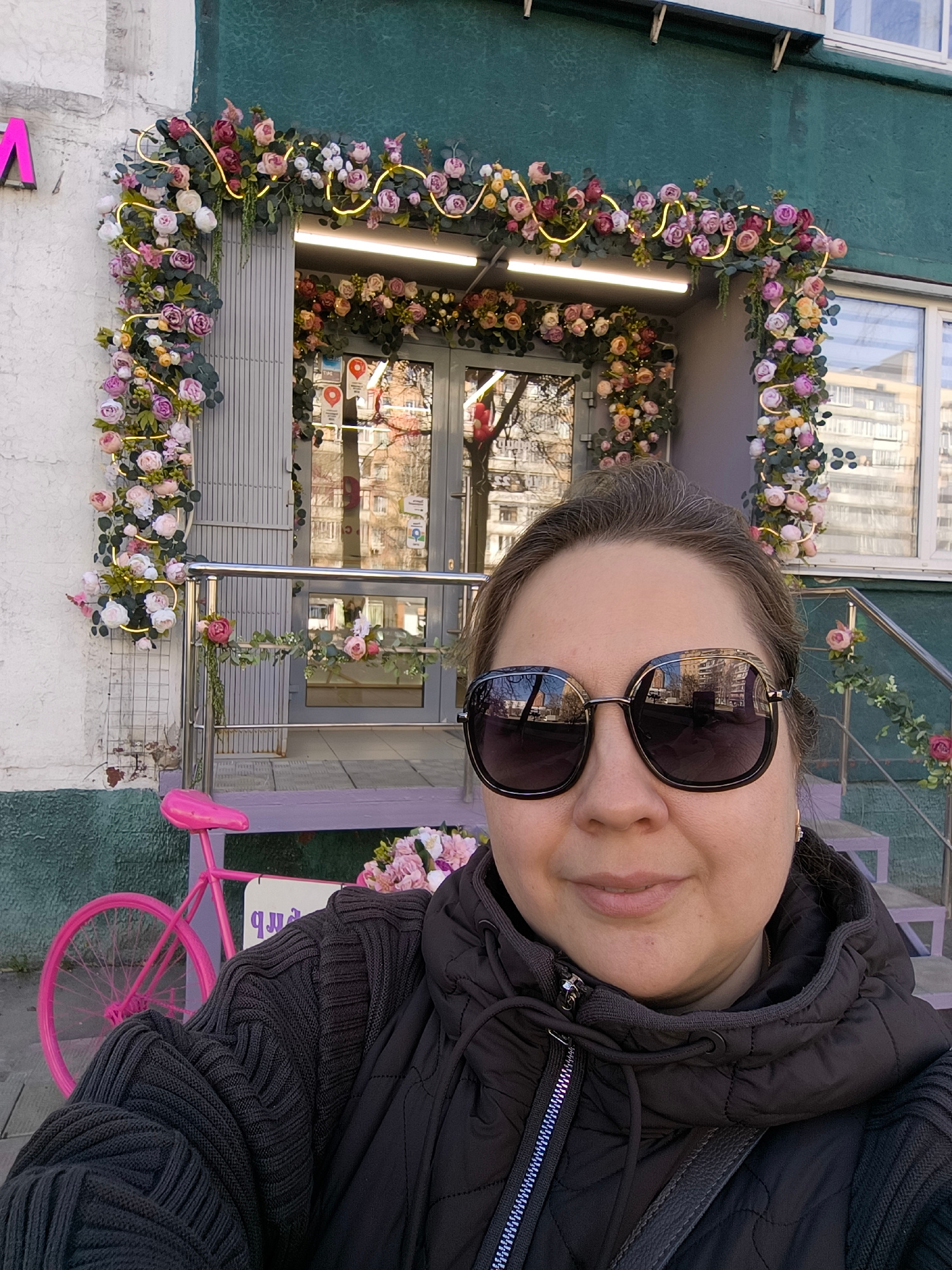 A medium shot depicts a woman in sunglasses and a black hooded jacket, posing in front of a flower-adorned storefront in Khimki, Russia. The entrance is decorated with an arch of flowers and fairy lig…read more