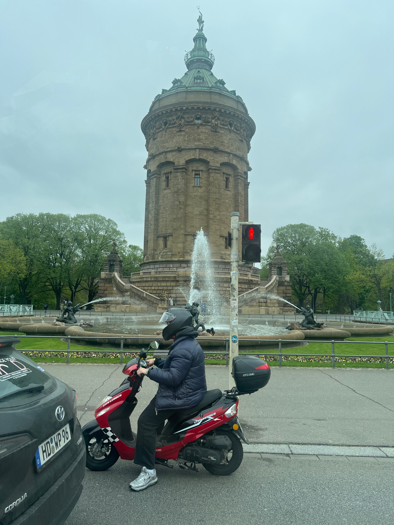 Here is a description of the image: The image shows a water tower in the city of Mannheim, Germany. In the foreground, a person wearing a helmet is sitting on a red scooter. The traffic light is red. A gray car is partially visible in the lower right of the image, its license plate reads "HD WP 96". Behind the scooter and the traffic light is a fountain, with multiple water spouts and sculptures. Behind the fountain is the water tower. The sky is overcast and the lighting is somewhat muted. | Open Wire