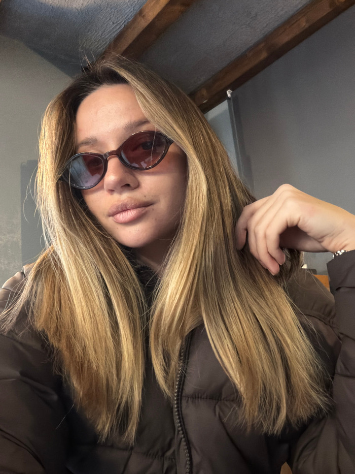 A female subject is depicted in a frontal, medium-close-up indoor shot. She has mid-length, straight light brown hair with blonde highlights, flowing over her shoulders. She wears dark brown, oval-sha…read more