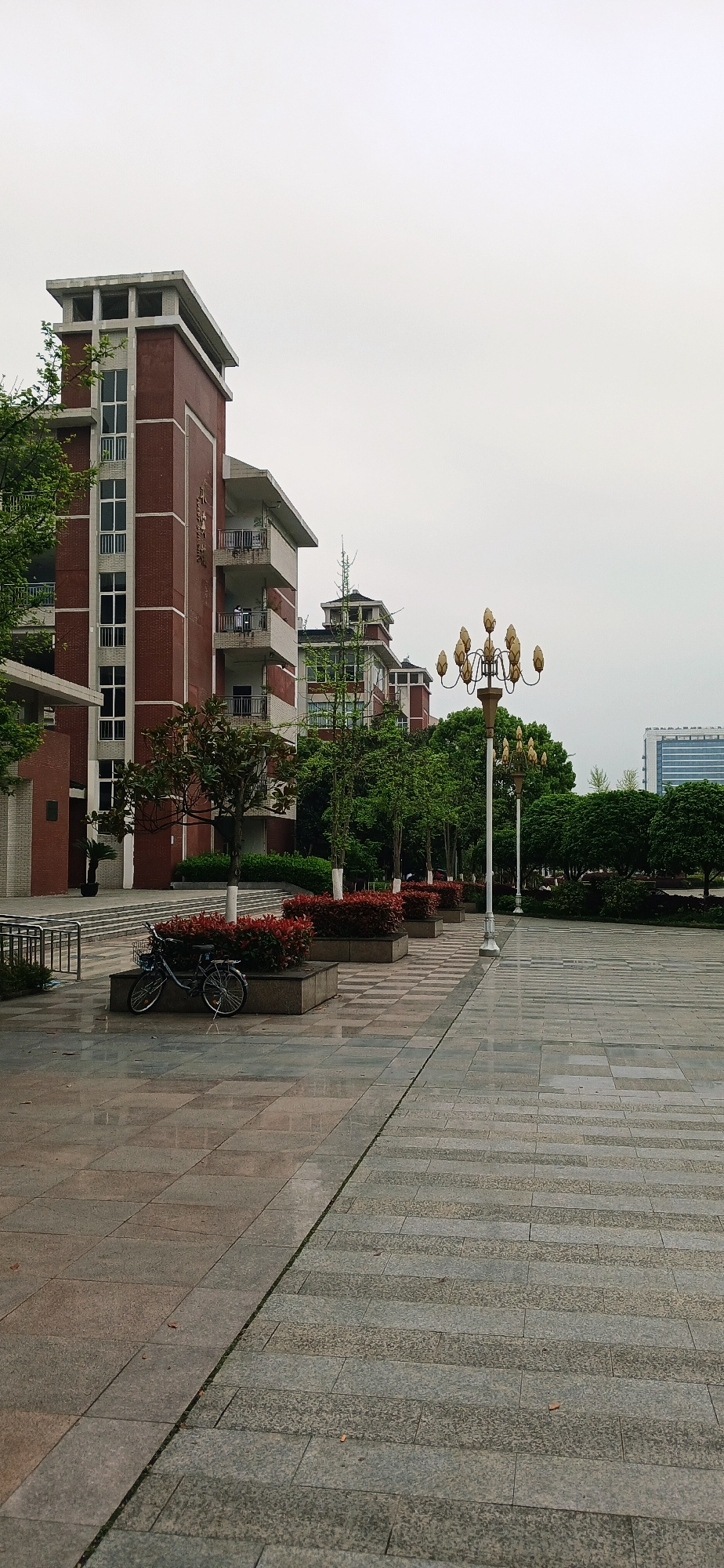 The image shows a street scene in Chongqing High-tech Zone, China. The foreground features a paved walkway of grey stone leading into the distance. Adjacent to the walkway is a raised flowerbed with r…read more