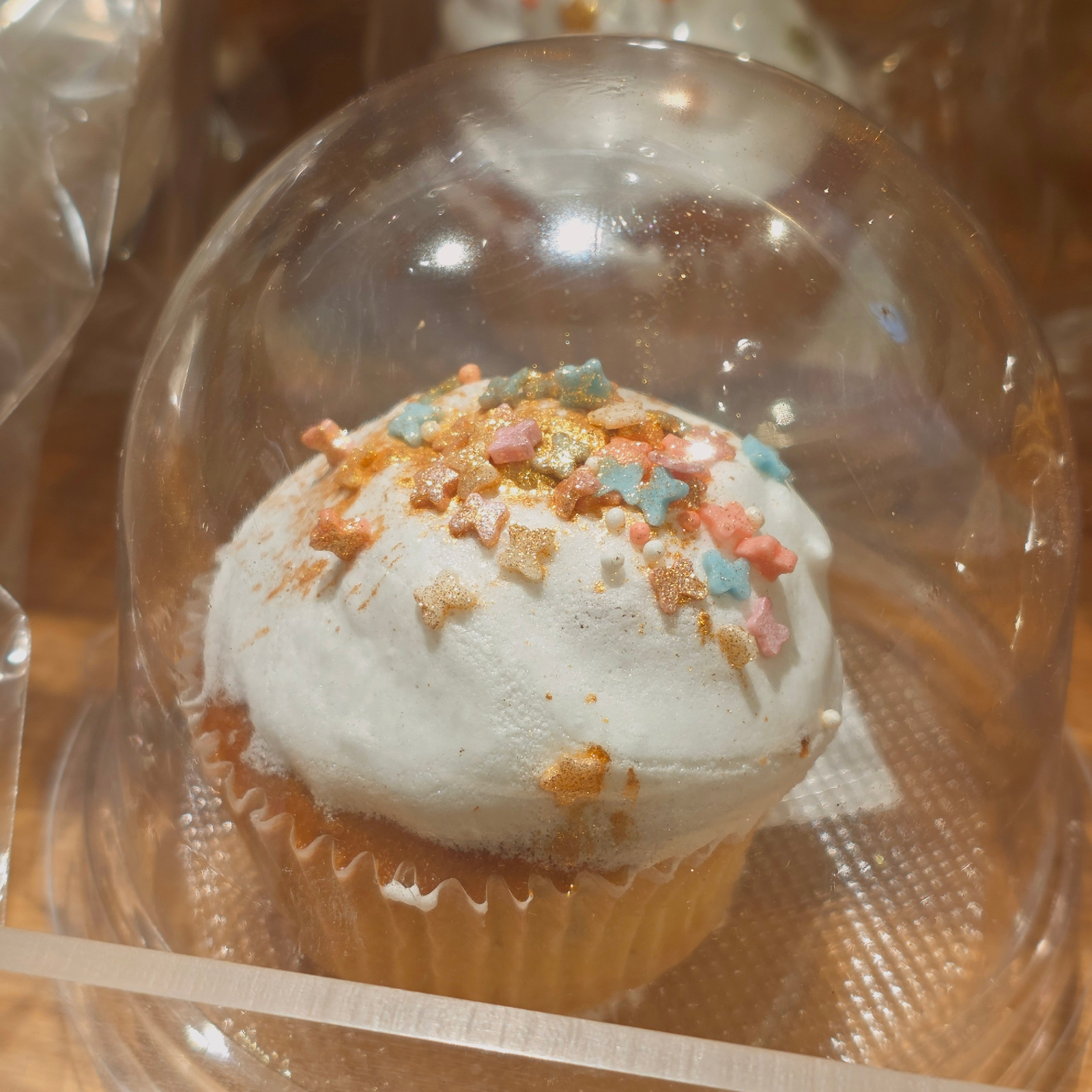 The image shows a cupcake in a clear plastic container. The cupcake has white frosting decorated with gold and pastel-colored star-shaped sprinkles. The background is slightly out of focus and appears…read more