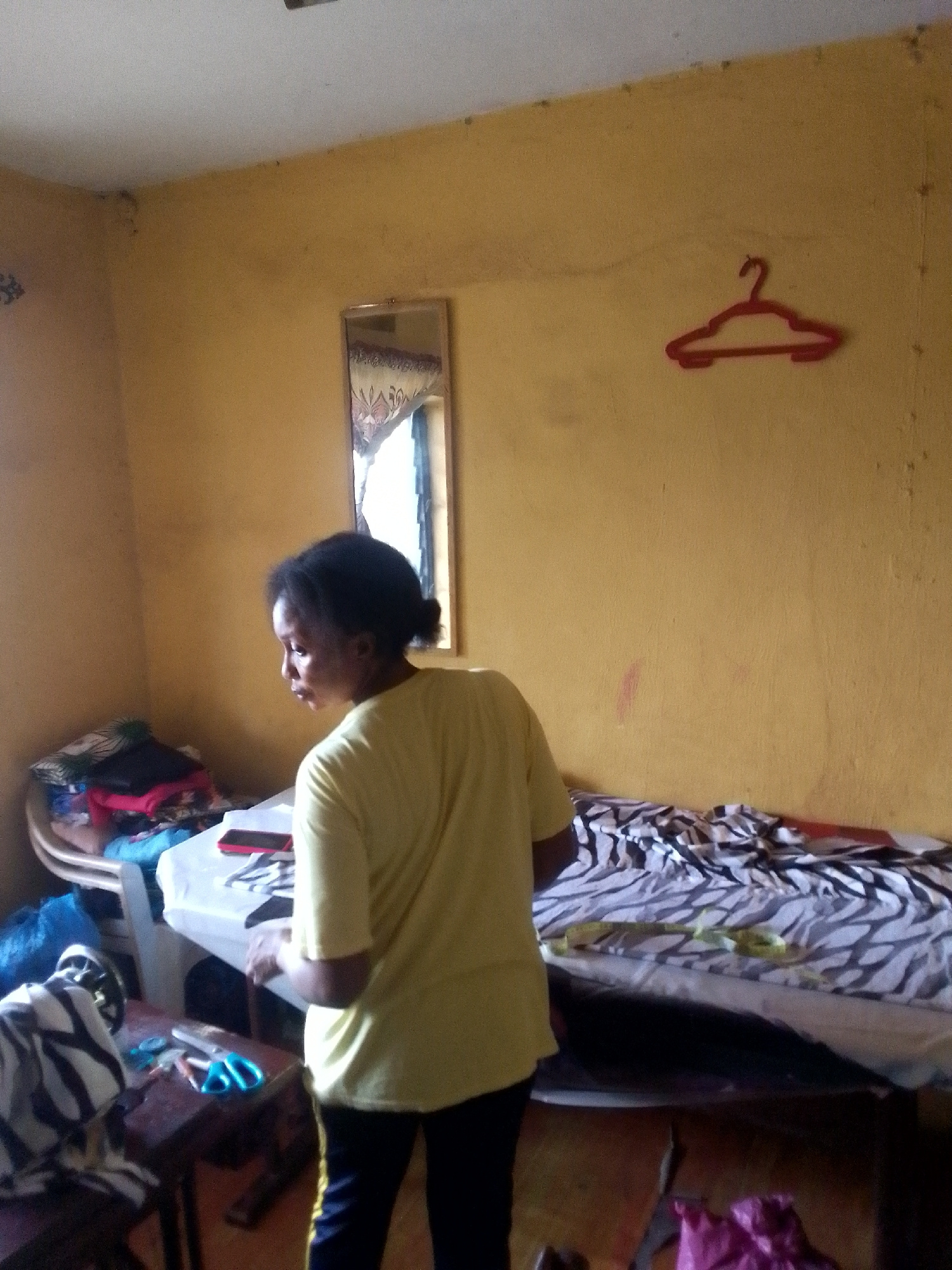 The image shows a person standing in a room in Unknown, Unknown. The walls are painted yellow and show signs of wear. There is a mirror on the wall, along with a red plastic hanger. A bed with a zebra…read more