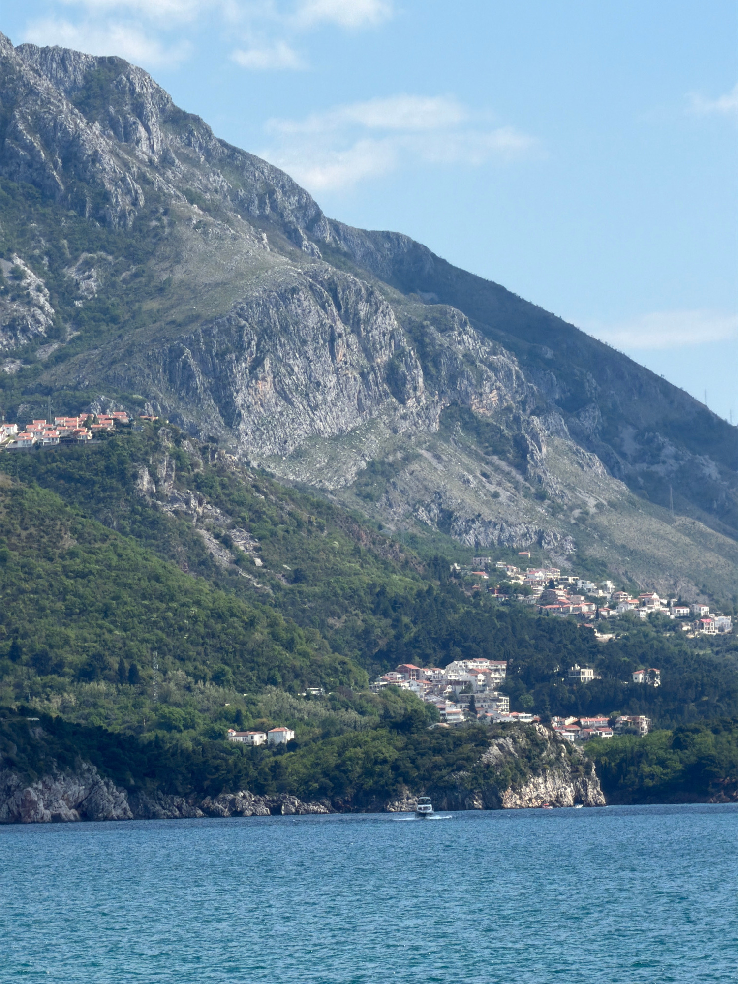 The image shows a steep, rocky mountain sloping down to a body of water, likely the Adriatic Sea, near Bečići, Montenegro. A dense green forest covers the lower slopes of the mountain. Clusters of whi…read more