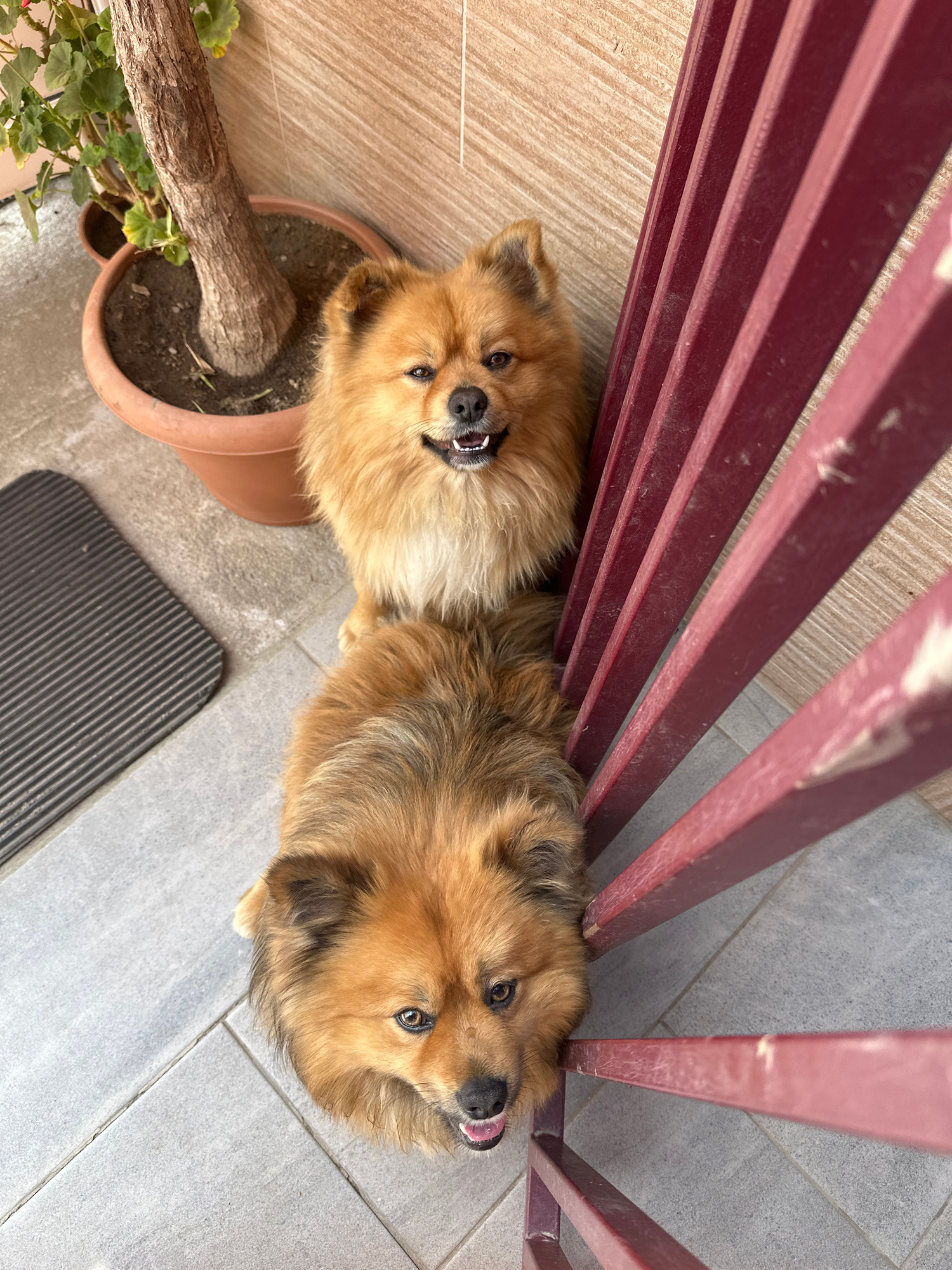A high-angle, rotated view shows two medium-sized, tan-colored dogs lying next to each other beneath a metal gate or fence with horizontal slats. The dog on the left is next to a brown plant pot with…read more
