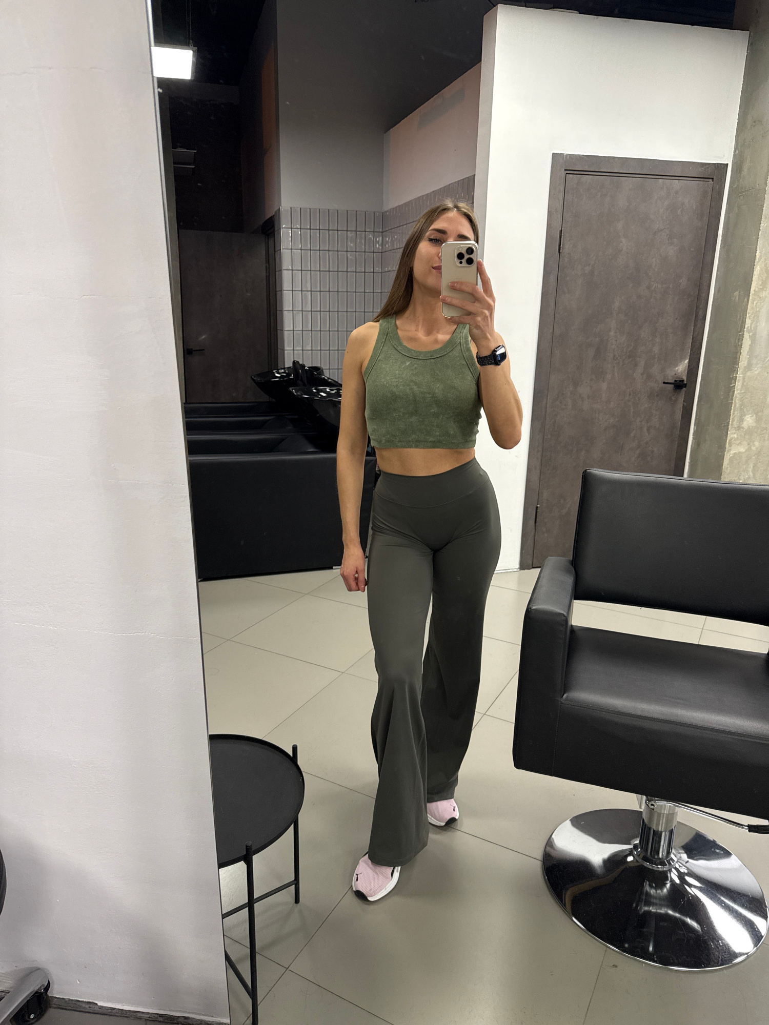 A woman takes a mirror selfie in a modern, industrial-style indoor setting. She stands, partially obscured by the phone she holds to her face, wearing an olive green ribbed crop top, dark gray-green f…read more