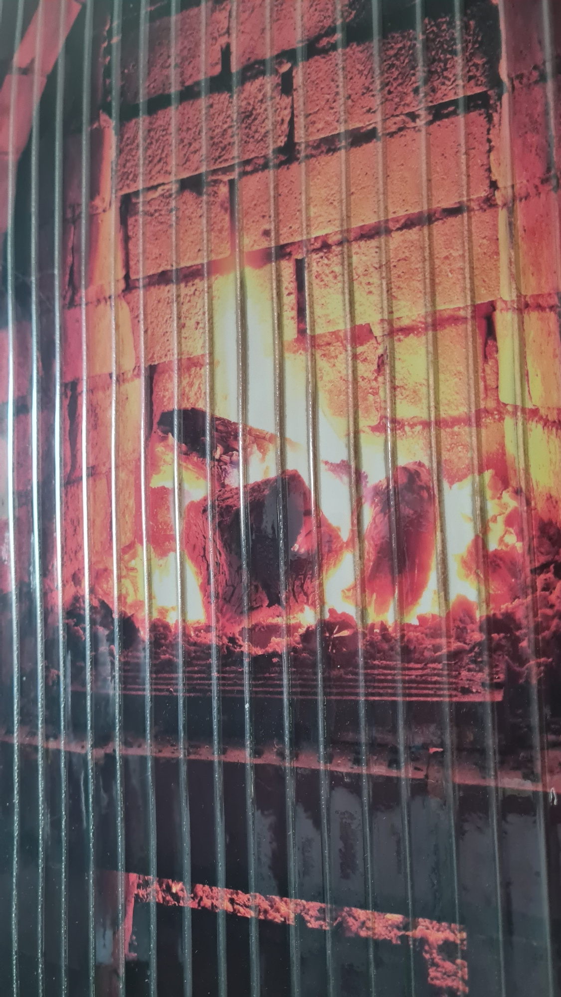 The image depicts a depiction of a fireplace behind horizontal bars. The fireplace is constructed of bricks and contains a fire. It is unclear what the image is printed on. There is no indication of t…read more