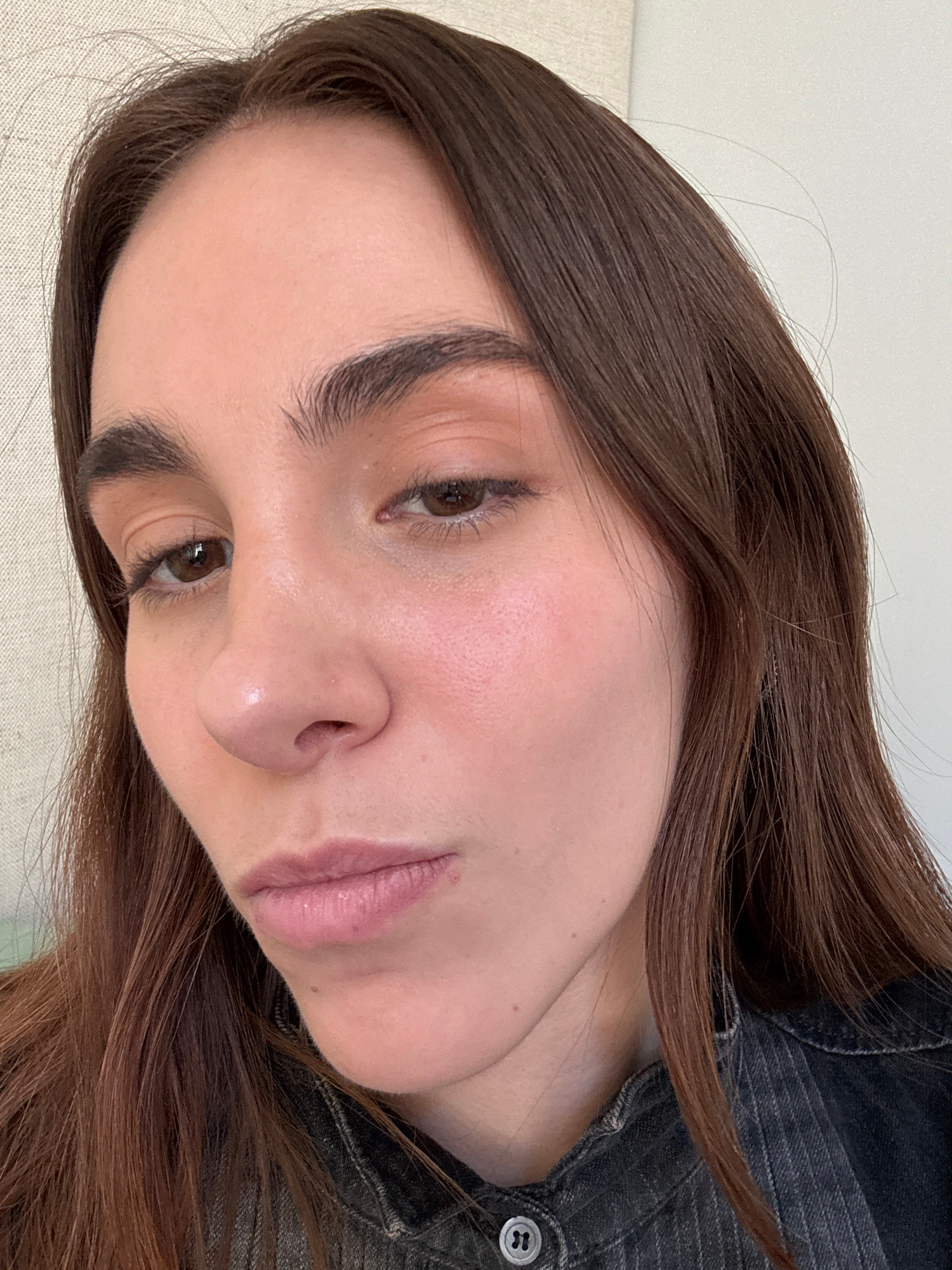 A portrait of a woman with long brown hair, brown eyes, and light skin. She is wearing a dark denim jacket. The background is a plain, light-colored wall. The image appears to be taken indoors. There…read more