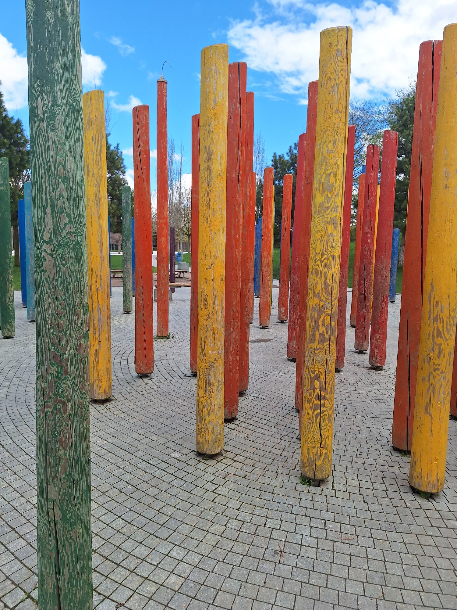 A ground-level, eye-level, outdoor shot shows an art installation of painted logs of varying heights, possibly in a park in the city of Krasnodar, Russia. The logs are vertically oriented and run paraβ¦read more