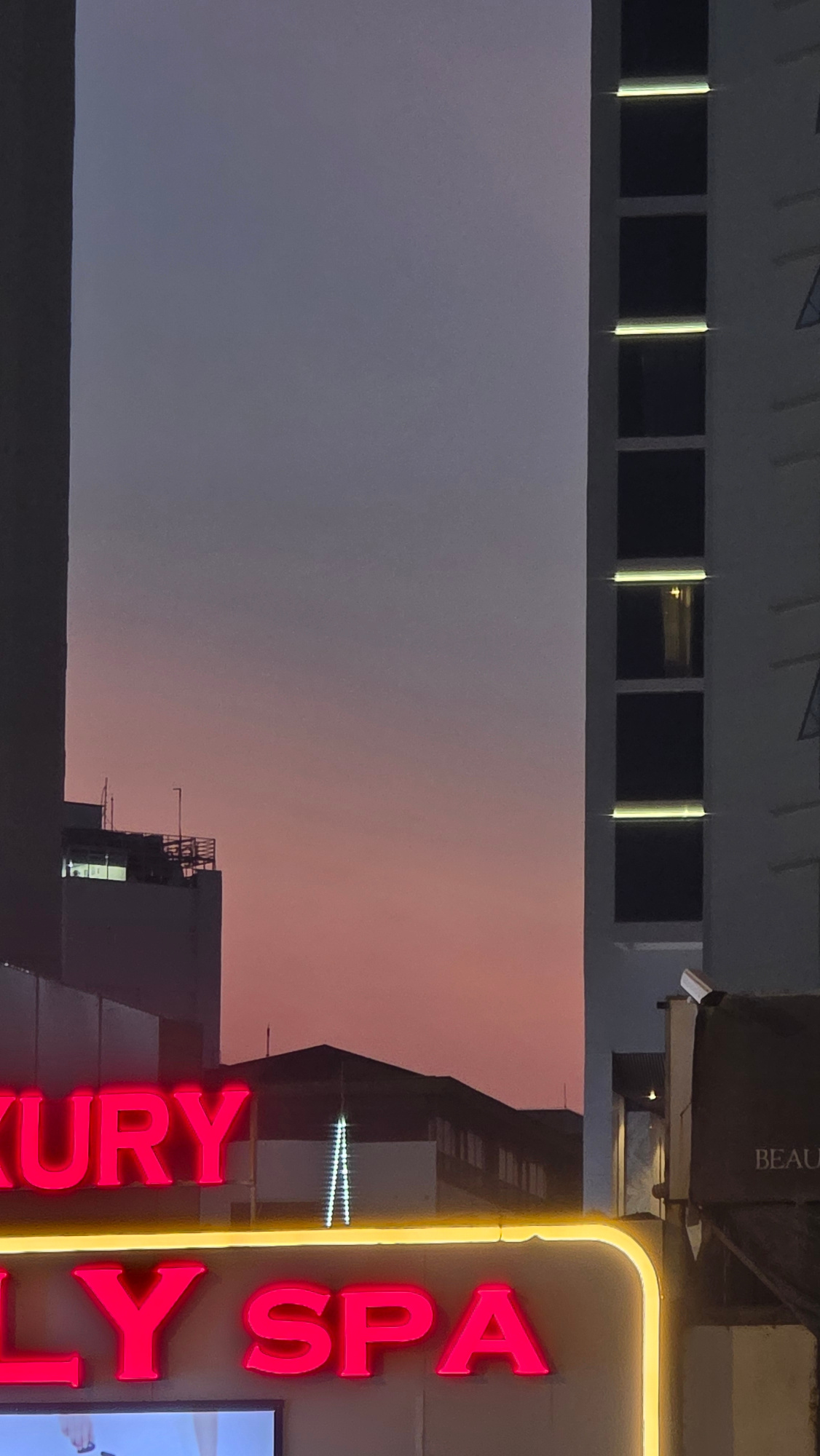 The image shows a twilight urban scene in Nha Trang, Vietnam. The foreground contains a tall building with a facade of regularly spaced dark windows and illuminated vertical elements. Adjacent to this…read more