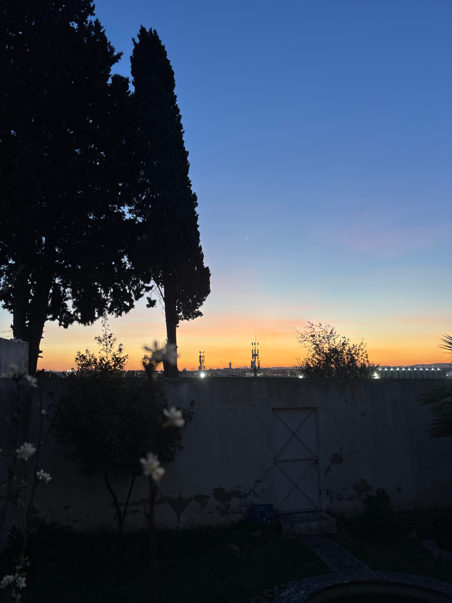 The image depicts a twilight scene, potentially a sunset, in an urban environment. The sky transitions from a clear blue to orange, possibly indicating the horizon. Silhouetted trees are present in th…read more