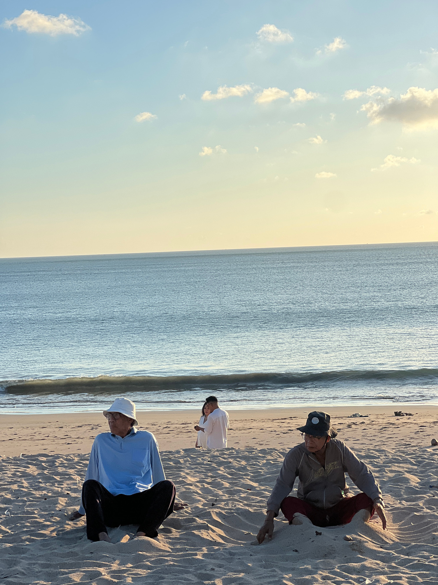 Three people are on a beach in Kuta, Indonesia. A person wearing a gray jacket, burgundy pants, and a black cap is on the right side, kneeling on the sand with their right leg stretched out to the sid…read more