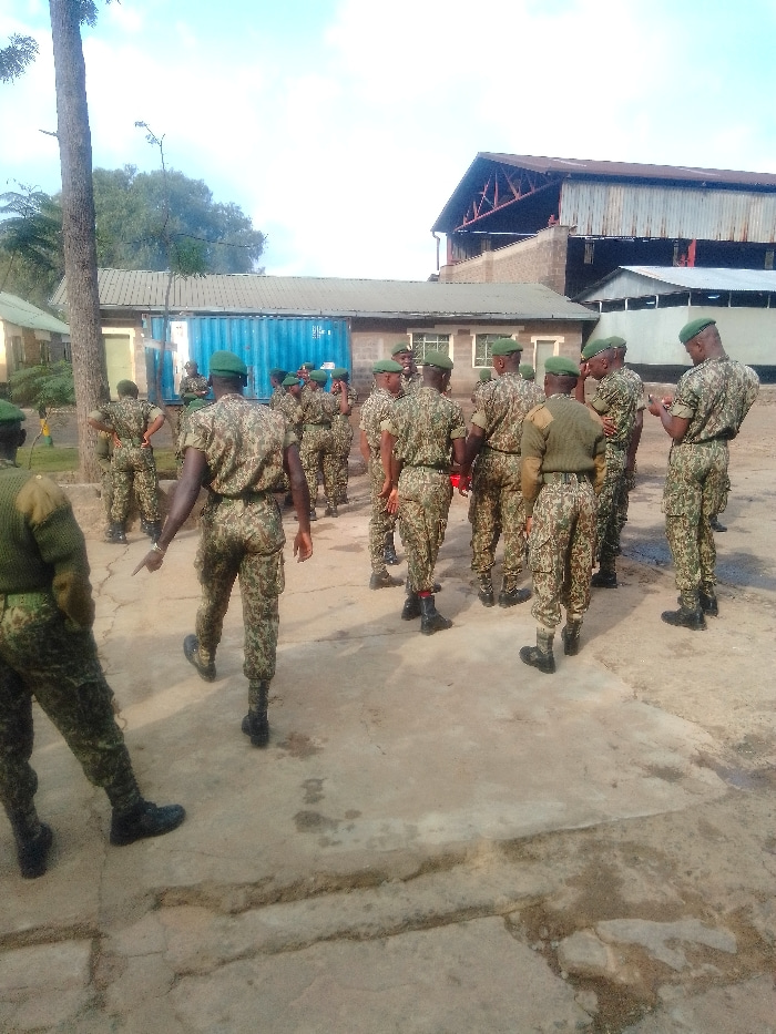 The image depicts an outdoor scene at an unspecified military or training facility in Nairobi, Kenya. Approximately 20-25 adult males, uniformly dressed in green and brown camouflage fatigues and gree…read more