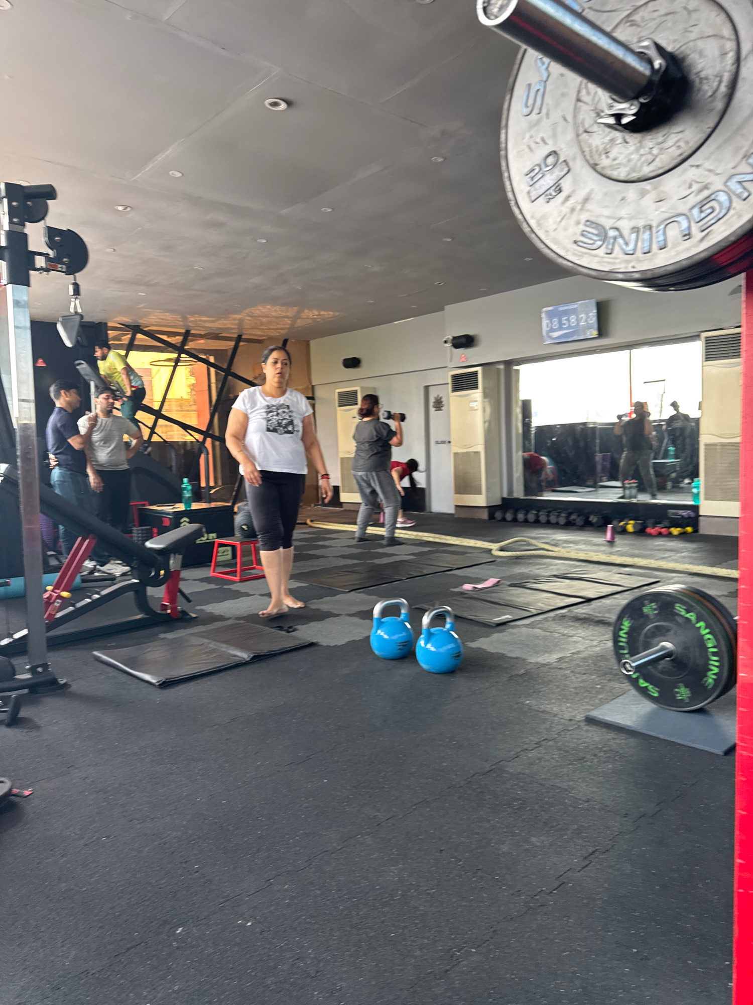 This is an indoor gym setting in Kolkata, India. There are several individuals engaged in exercise: one woman in a white t-shirt and black shorts stretches on the floor, while two other men are active…read more