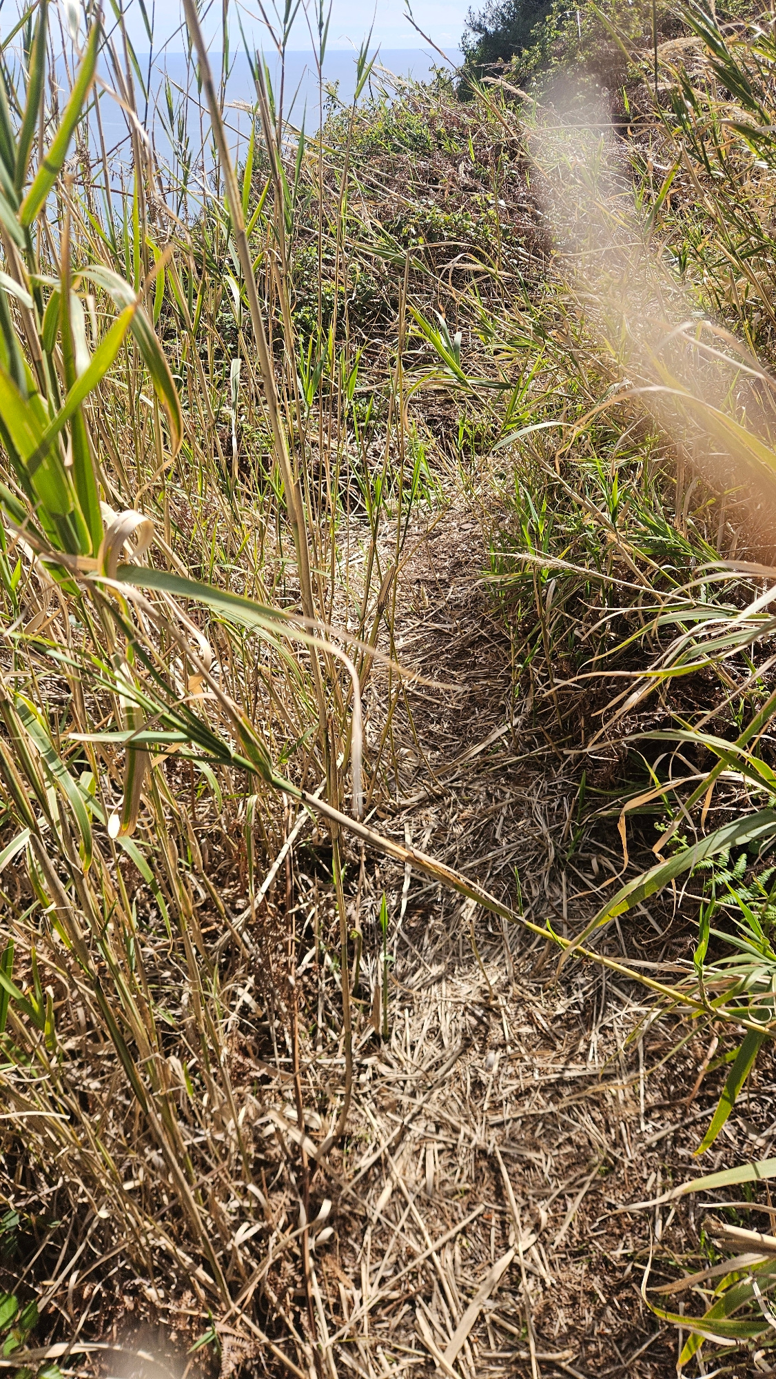 The scene depicts a ground-level view of overgrown vegetation, likely in a natural or semi-natural setting. A mixture of green and brown grasses and plants cover the ground. The ground appears dry, wi…read more