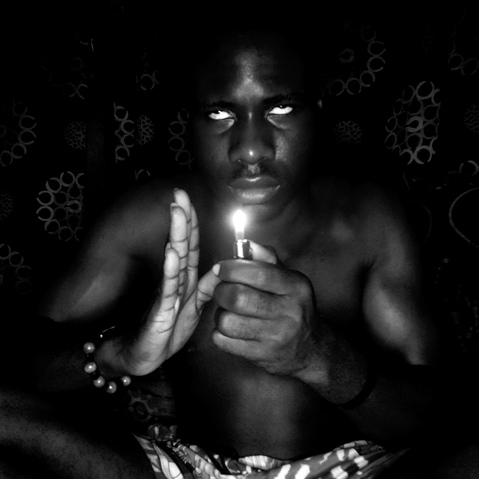 A black and white image of a person holding a lighter. The person is lying down on a patterned surface. The person's face is visible and their eyes are open and directed towards the camera. A lighter…read more