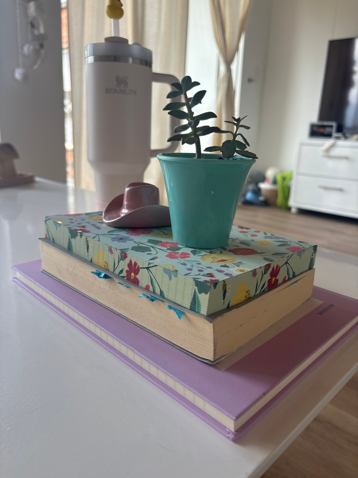 A close-up shot depicts a stack of three books resting on a white surface. From bottom to top, the books are light purple with "NOTEBOOK" printed on the cover, a worn, tan-edged book with a floral pat…read more