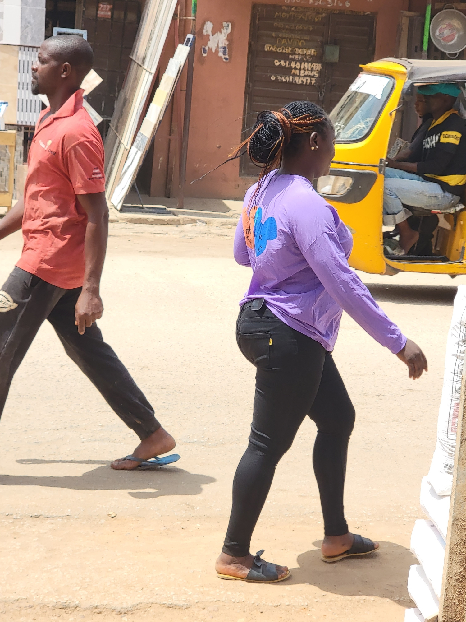 The image shows an outdoor scene in Maiburiji, Nigeria, with two people walking on a street. A woman in a purple long-sleeved shirt and black leggings walks with her arms raised slightly. Nearby, a ma…read more