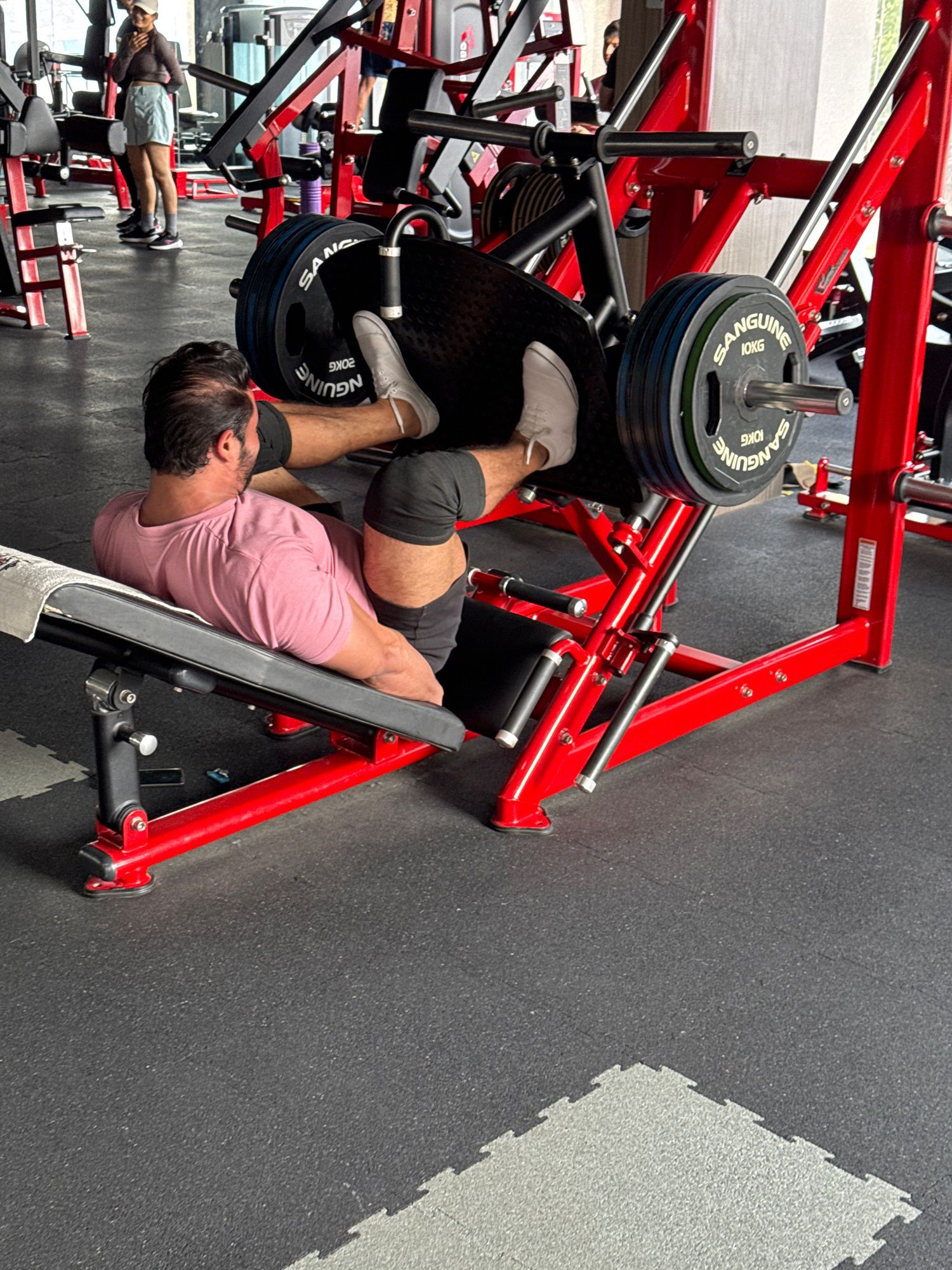 A man is using a leg press machine in a gym. The machine is red and has several weight plates loaded onto it. The man is wearing a pink t-shirt, grey shorts, and knee pads. He has white sneakers and w…read more