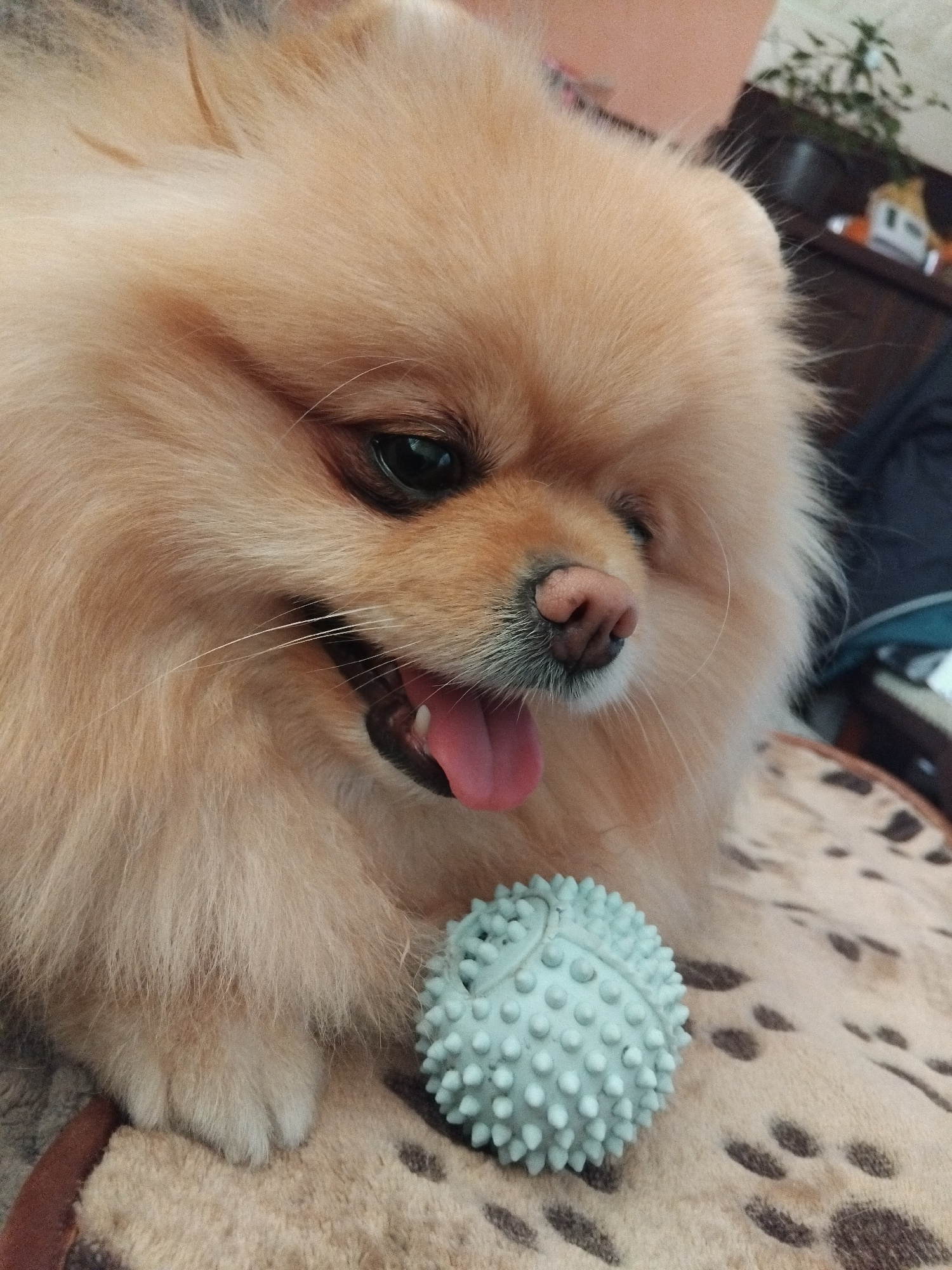 A close-up shot of a light-brown Pomeranian dog lying on a patterned blanket. The dog has a pink nose and tongue sticking out. A light-blue rubber ball with nubby texture rests next to the dog. The lo…read more