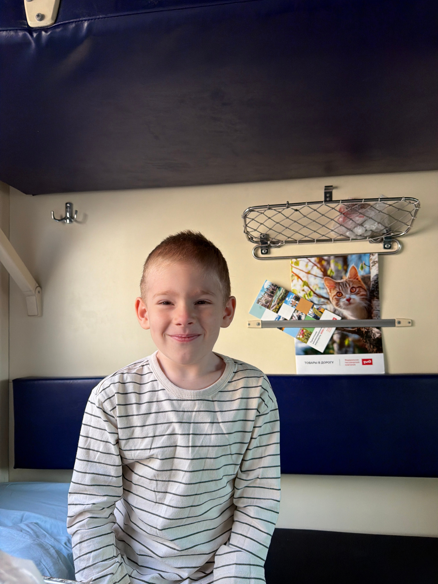 A young boy with short, light-brown hair and fair skin is smiling at the camera. He is wearing a striped, long-sleeved shirt. The boy is in what appears to be a train compartment. Behind him are a blu…read more