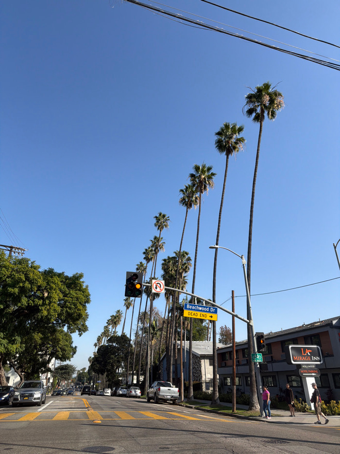 A street scene with tall palm trees lining the sidewalk. The sky is blue. Street signs indicate "Beachwood Dr. - Dead End". A traffic light glows yellow. Cars are parked along the street. In the upper…read more