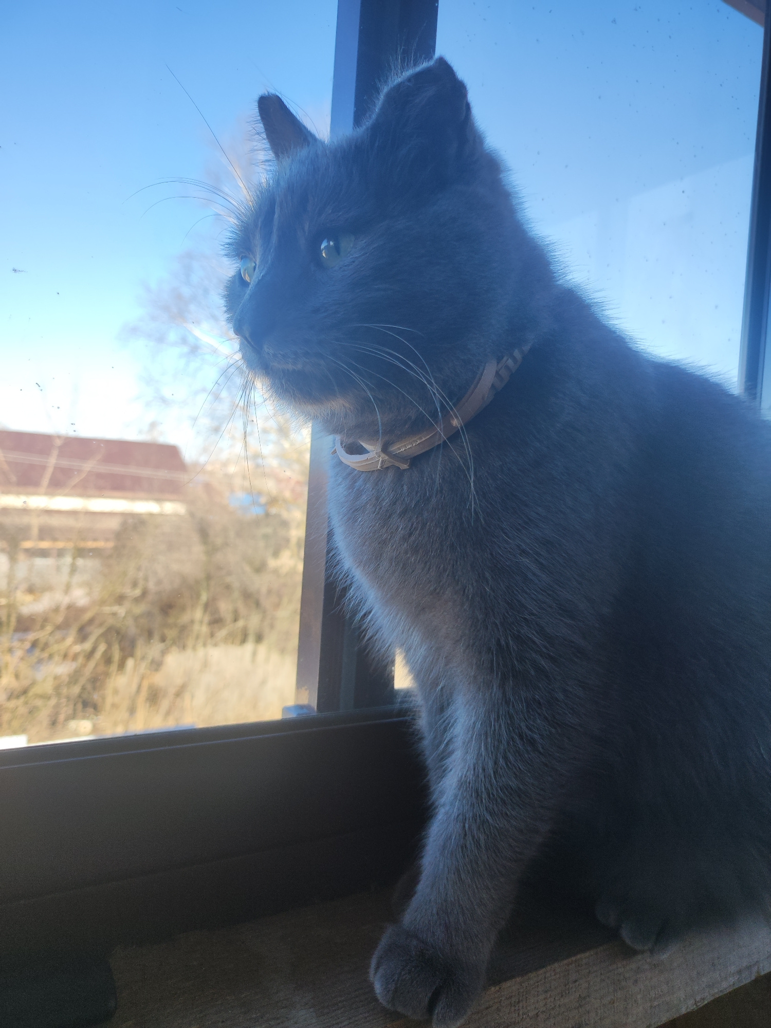 A gray cat with green eyes and a light-colored collar is sitting on a window sill, looking out the window. The background outside the window includes trees without leaves, a building with a red roof,…read more
