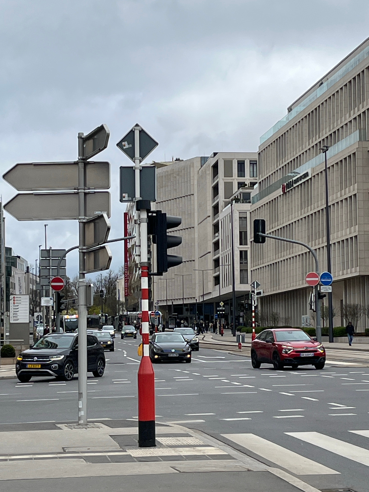 The image shows a street scene in Luxembourg City, Luxembourg. The photograph is oriented sideways. A tall, modern building with a repeating window pattern dominates the upper half of the frame. The l…read more