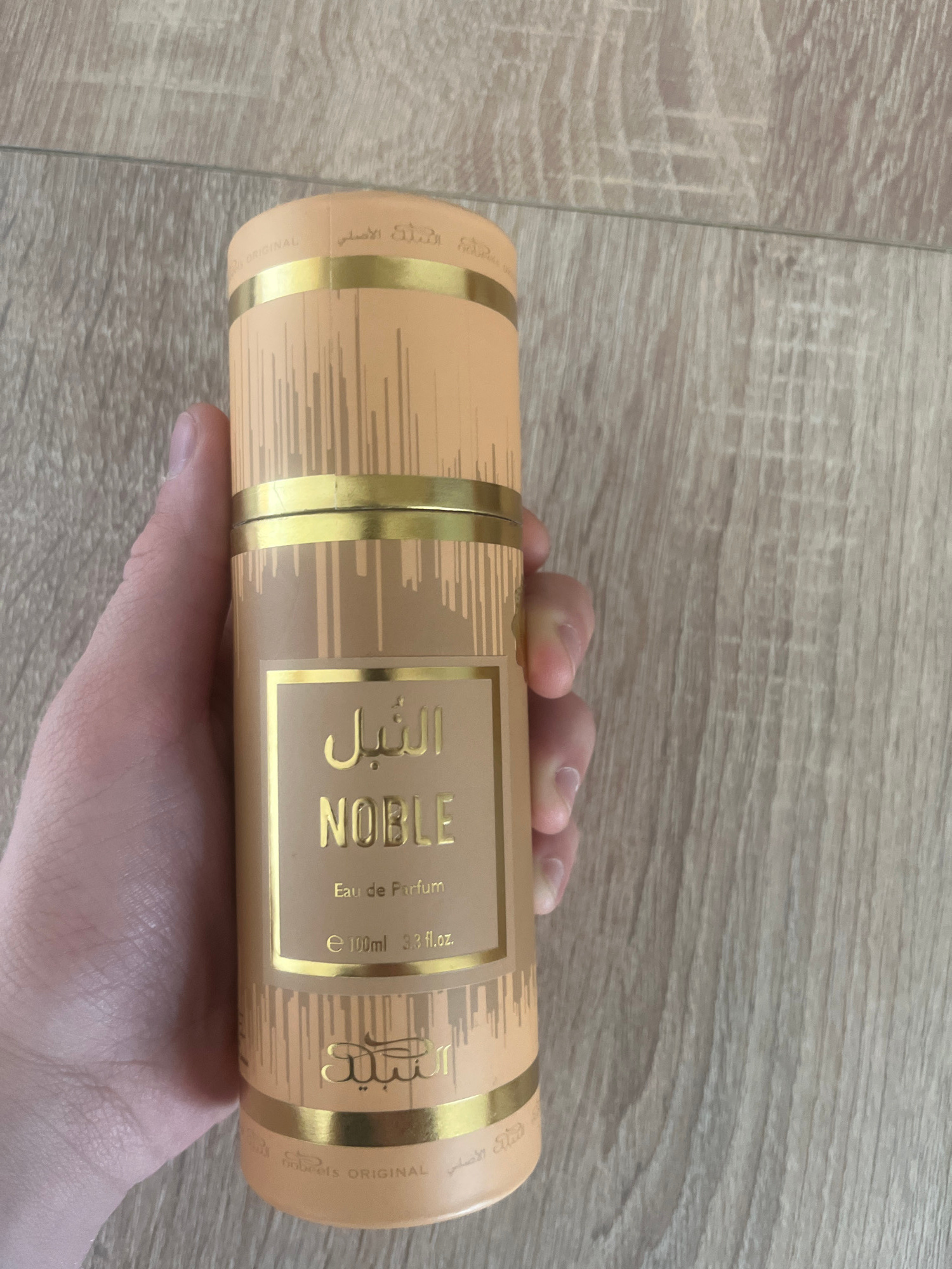 A hand is holding a cylindrical box with the word "NOBLE" printed on it, along with Arabic script. The box is mostly beige with gold accents. Text on the box indicates it contains Eau de Parfum in a 1…read more