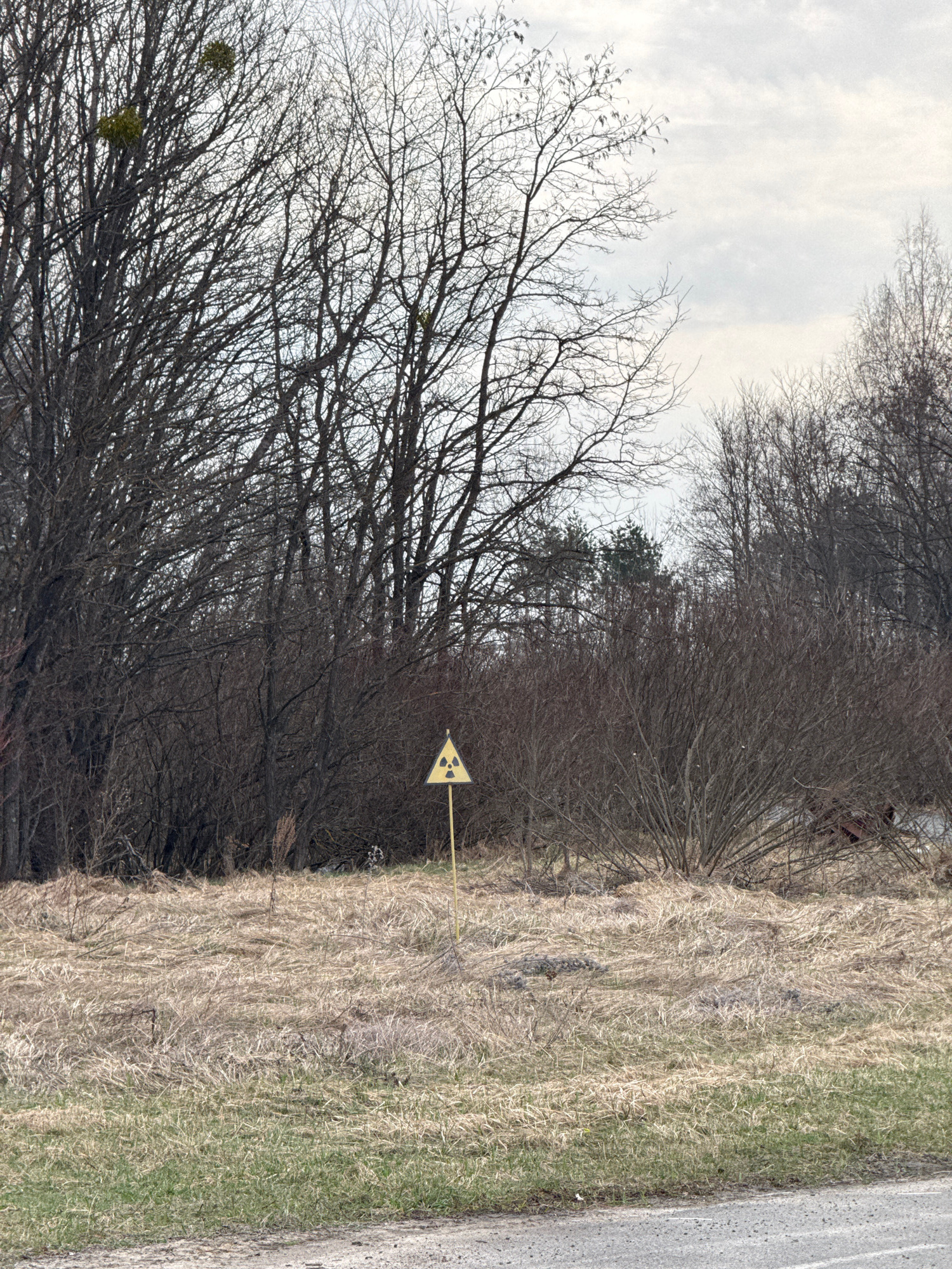 A slightly rotated, eye-level shot depicts a roadside scene near Pryp'yat', Ukraine. The left of the frame is dominated by dense, bare trees, their branches intertwining against a pale, overcast sky.…read more