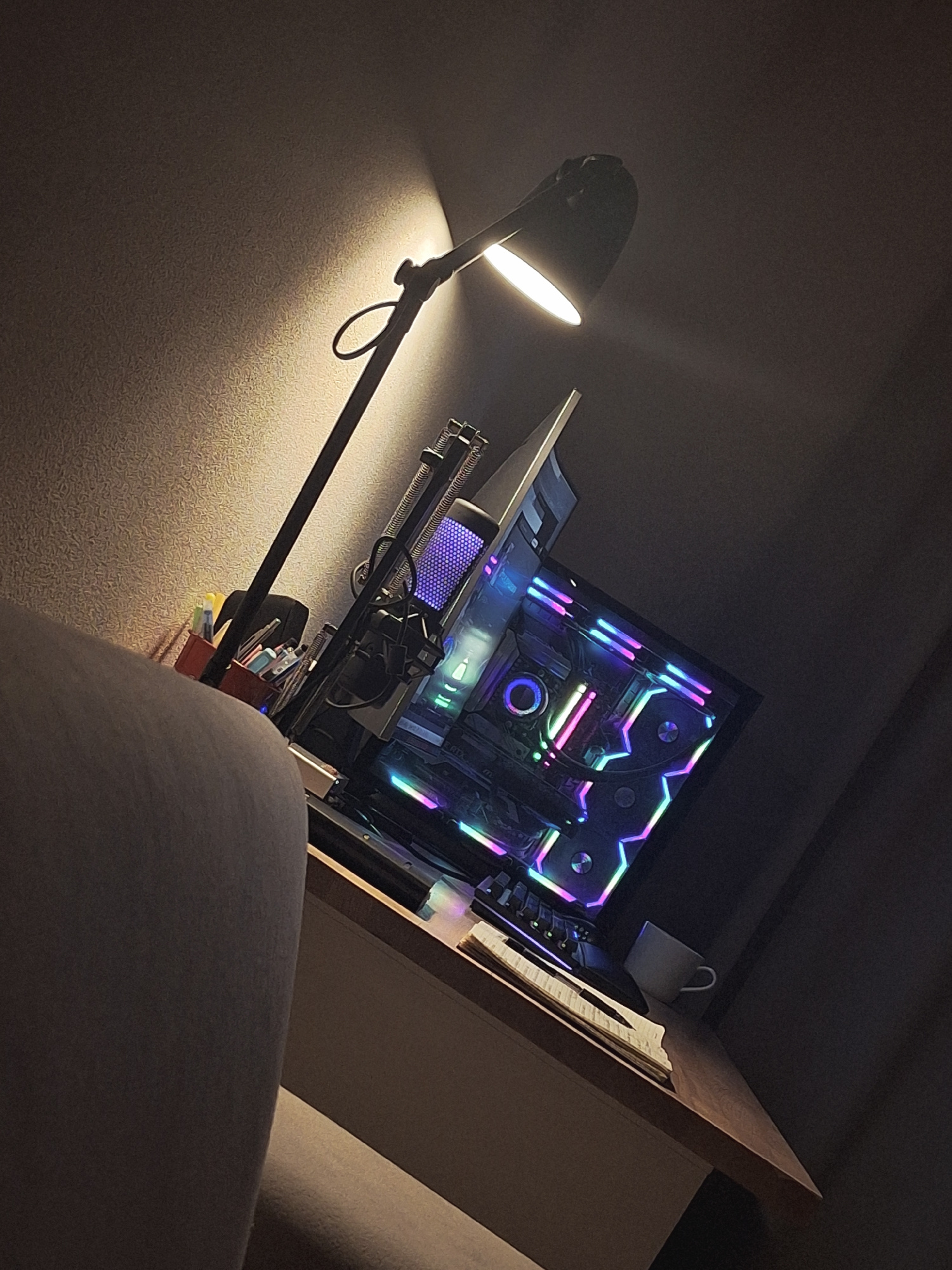 The image presents a desk setup in a dimly lit room. A desk lamp illuminates the wall to the left, casting a bright spotlight. The focal point is a computer tower with glowing RGB lights, showcasing i…read more