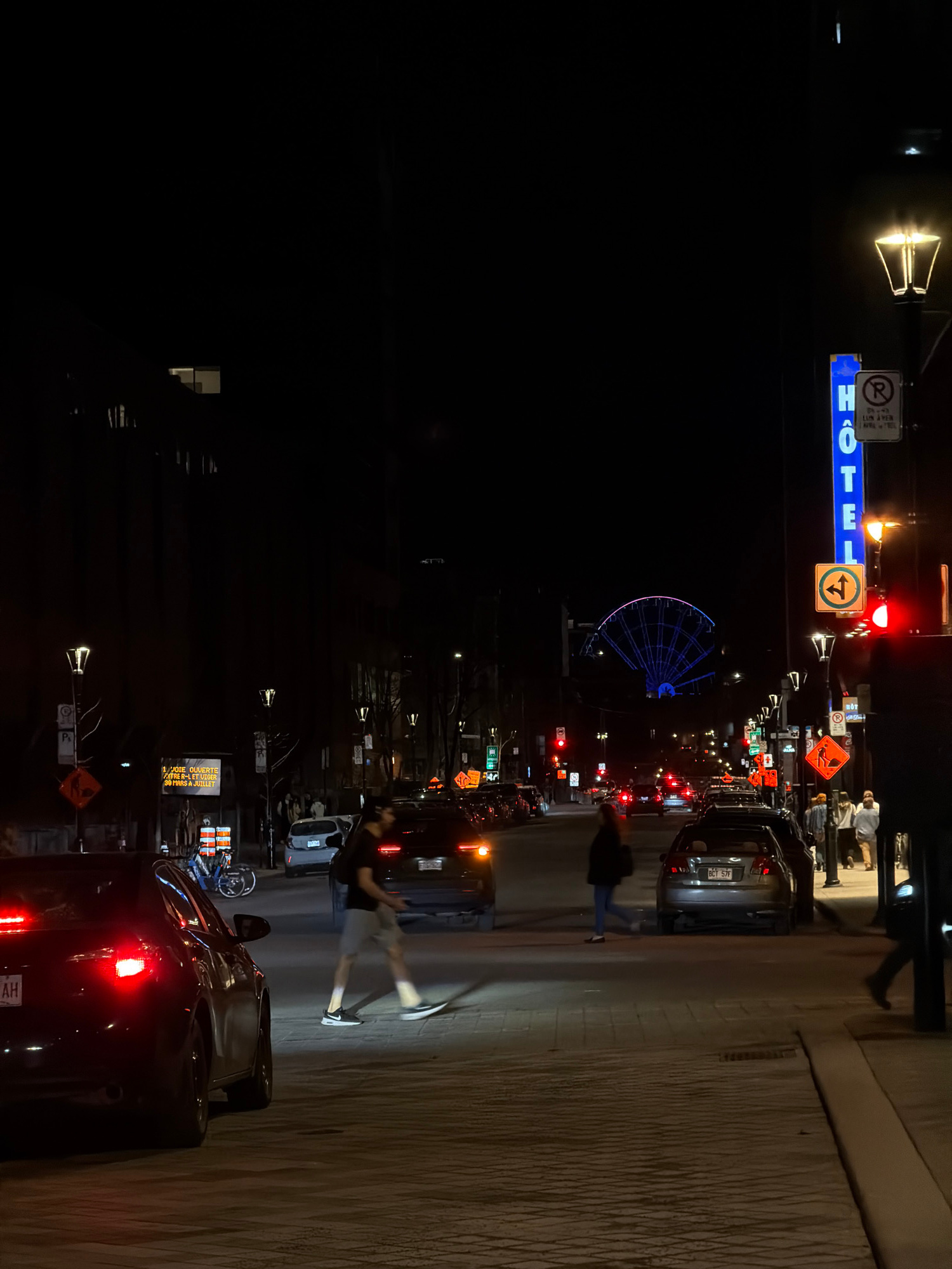 The image captures a vibrant night scene on a city street, illuminated primarily by artificial lights. A large, brightly lit Ferris wheel, glowing in shades of blue and purple, dominates the mid-groun…read more