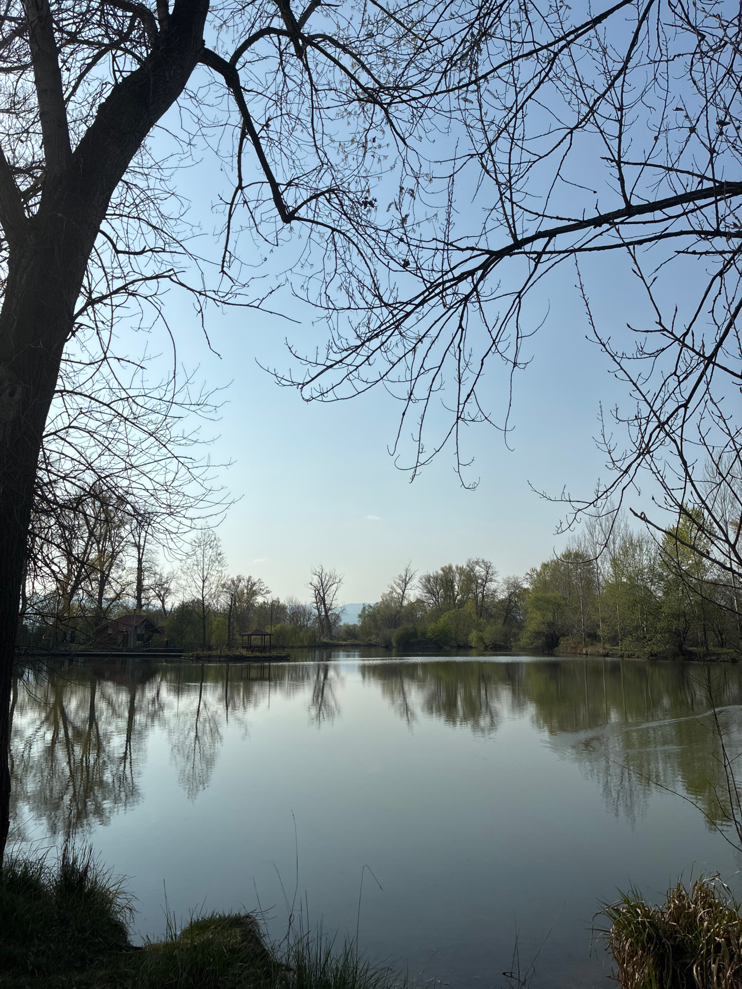 The photograph is a wide-angle shot of a lakeside scene in Septemvri, Bulgaria. The image is oriented with the sky and tree branches at the top of the frame. A body of water, reflecting the landscape,…read more