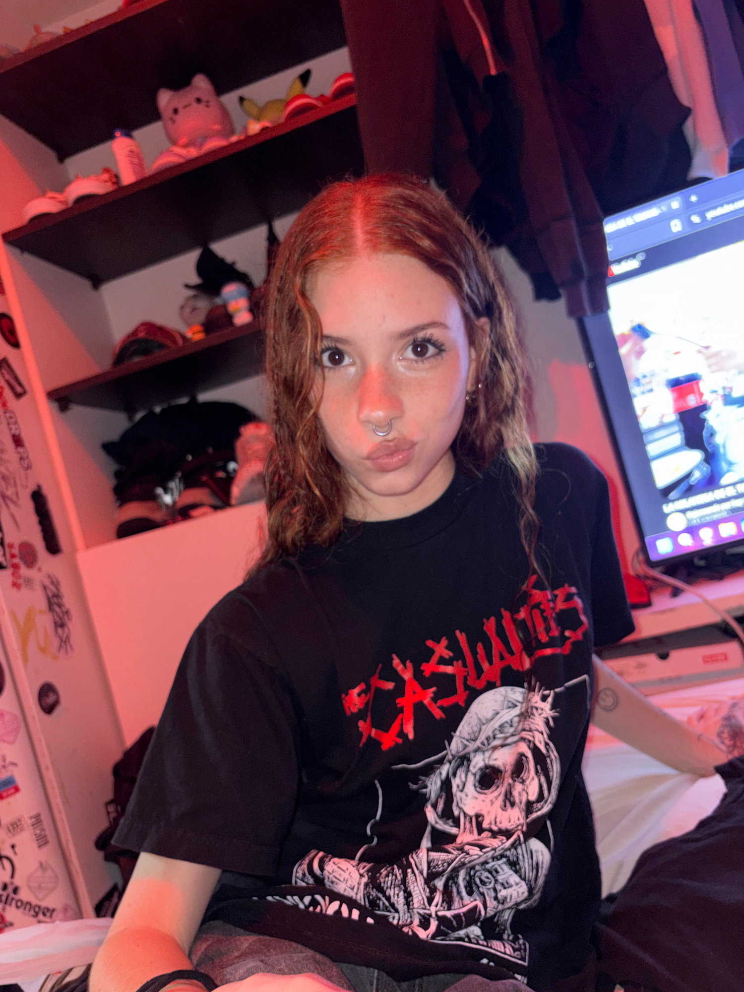 A young person, likely female, with reddish-brown, wavy hair, is captured looking directly at the camera with a neutral to slightly pouting expression. She has a silver septum piercing and is wearing…read more