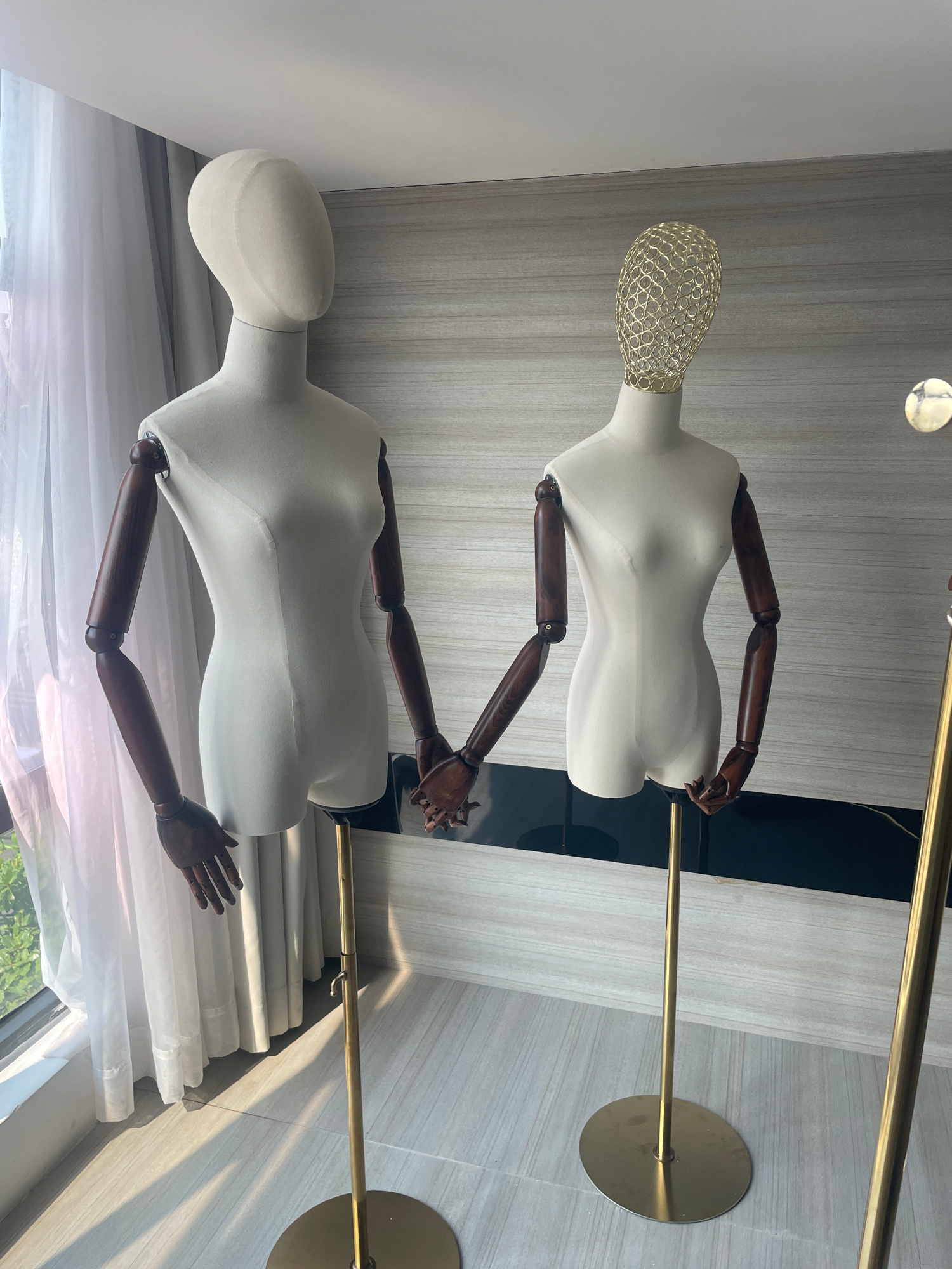 The image shows two mannequins indoors. The mannequins are torso-shaped and white, with dark wooden arms. One mannequin has a metallic, cage-like head. They stand on golden poles with circular bases.…read more