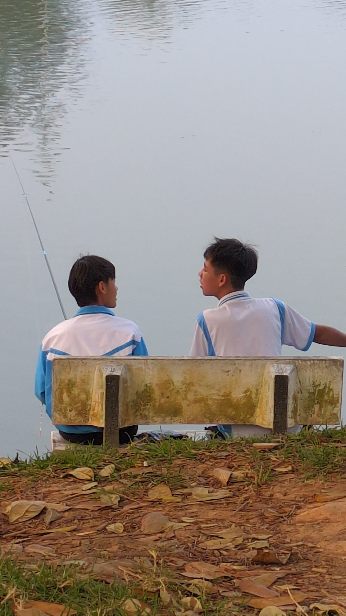 Two young men are fishing side-by-side, facing a body of water. They are wearing matching white shirts with blue trim. They are positioned near the edge of the water, which is bordered by dirt, grass,…read more