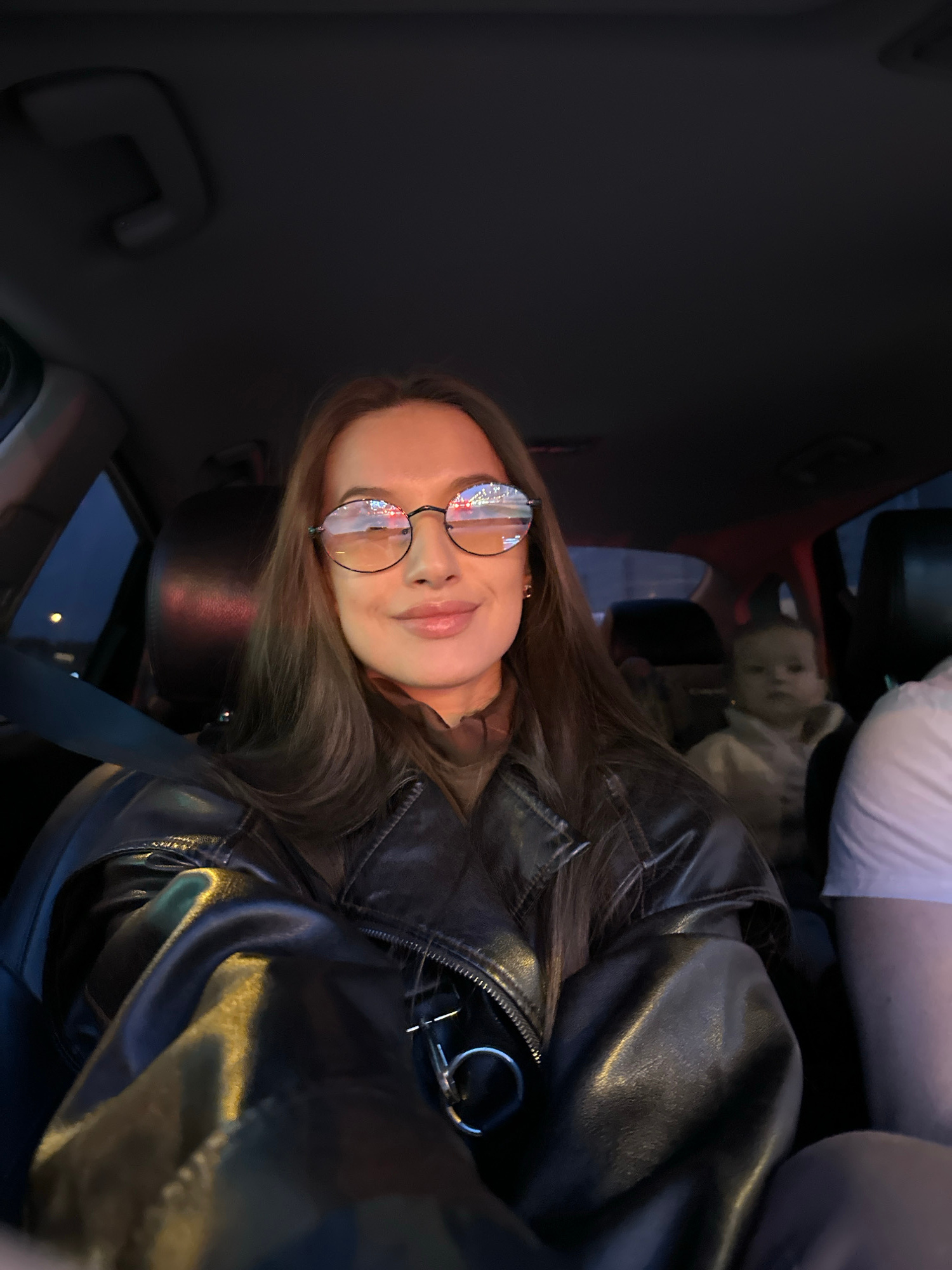 A person wearing round glasses and a black leather jacket is sitting in a car. The person is facing the camera with a slight smile. The car appears to be in motion at night, as reflected in the glasseβ¦read more