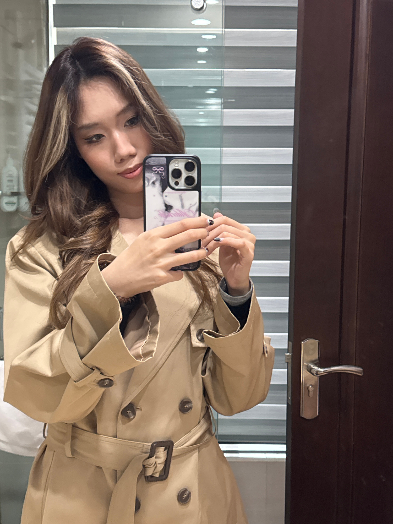 A woman with brown hair highlighted blonde is taking a selfie in front of a mirror. She is wearing a tan trench coat. The background features vertical blinds and a dark brown door with a silver hook.…read more