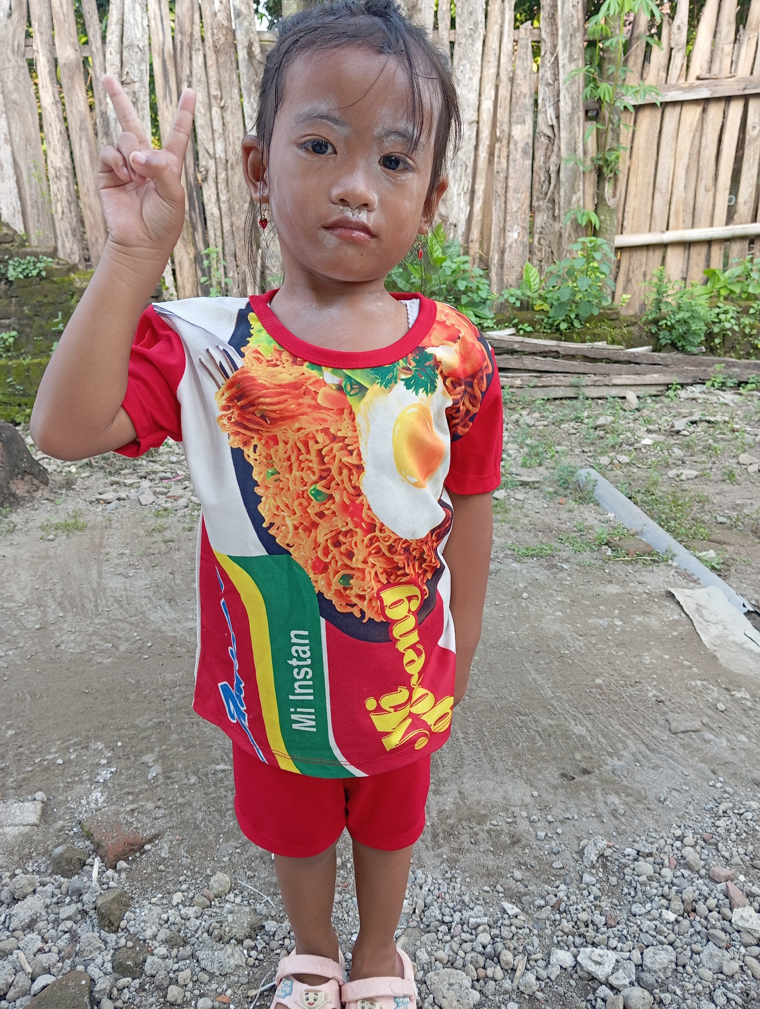 A young child stands outside, making a peace sign with their left hand. They are wearing a red and white shirt featuring a graphic of Indomie Mi Goreng instant noodles with a fried egg. The child is a…read more